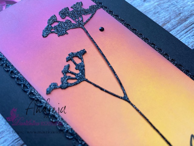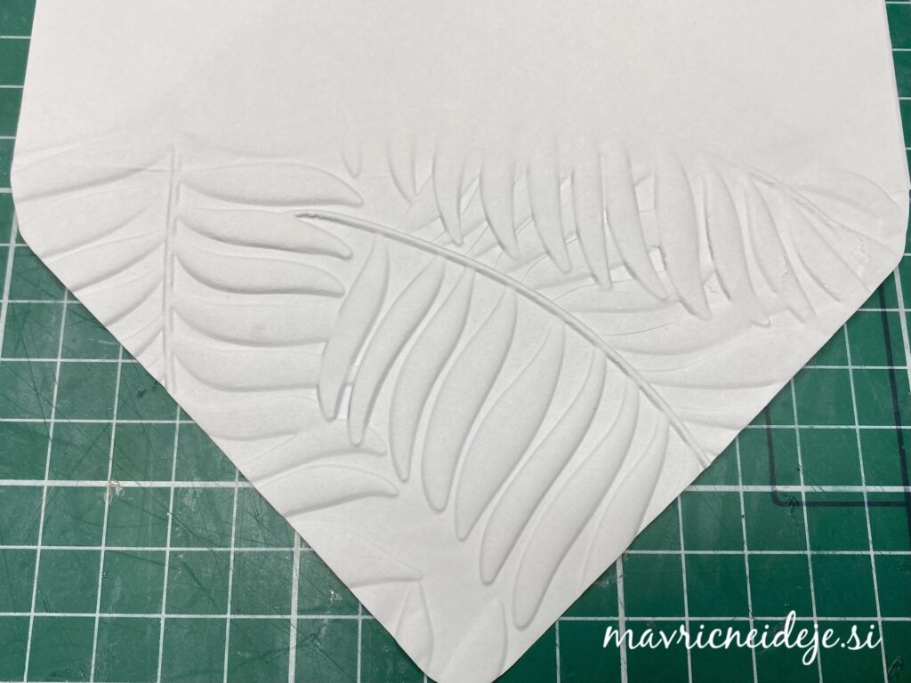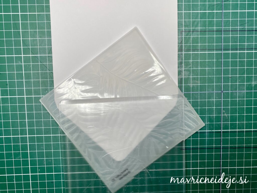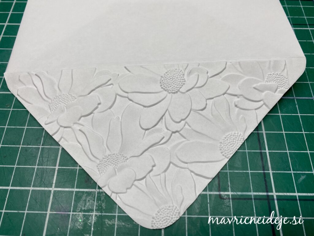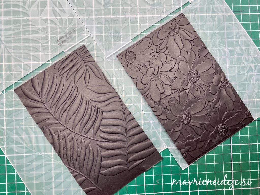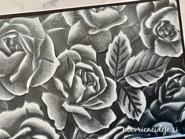 Izbrala sem zelo staro štampiljko z motivom travniškega cvetja in s črno blazinico naredila odtis na dva papirja enakih velikosti. Prvi odtis sem namestila na osnovo za voščilnico iz drugega pa sem izrezala motiv mreže.