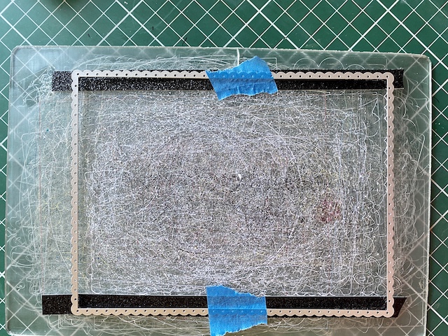 Motiv mreže sem nato namestila na papir z odtisom. Tako je se motiv nemoteno nadaljuje z ozadja preko mrežastega vzorca. Dodala sem še napis.