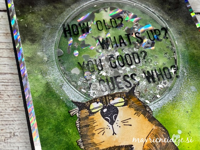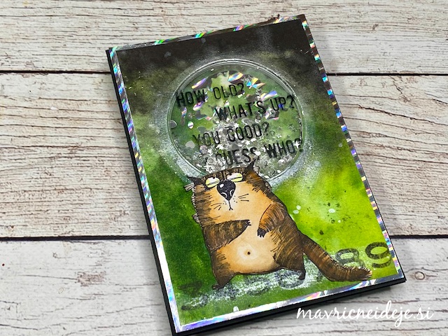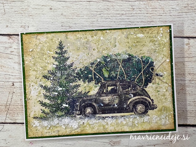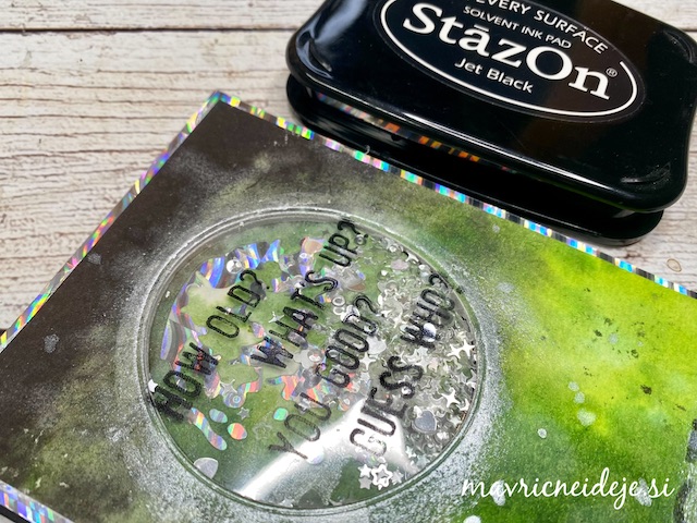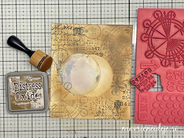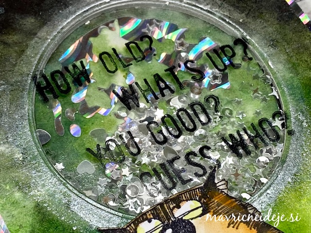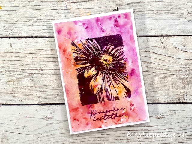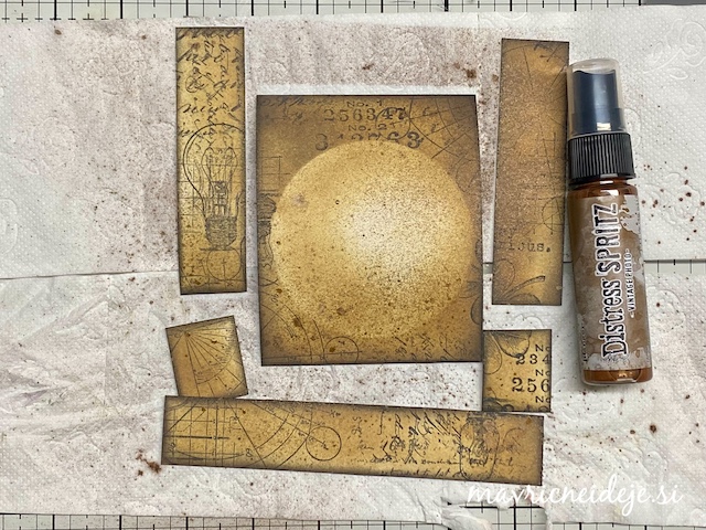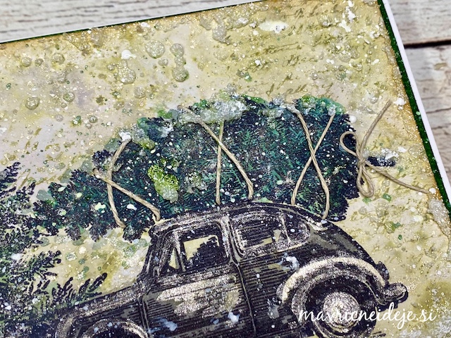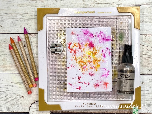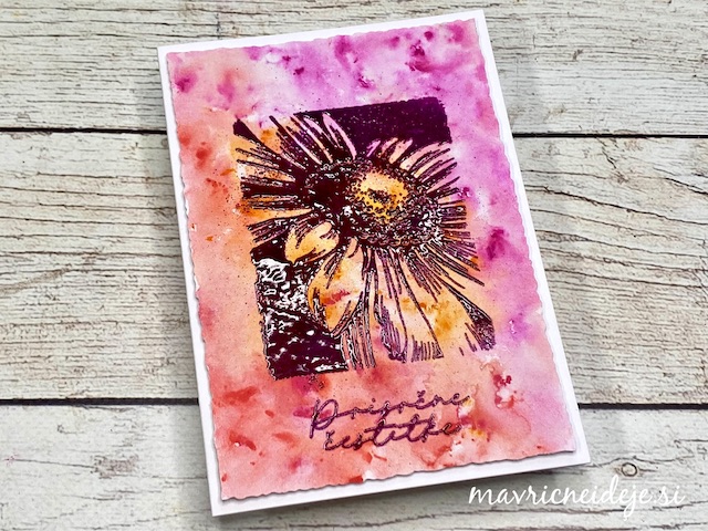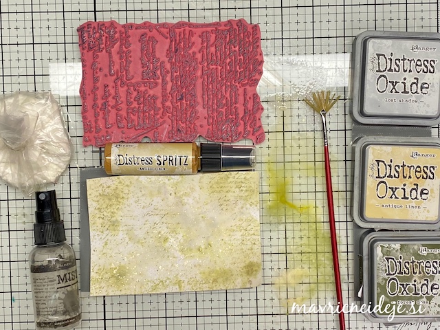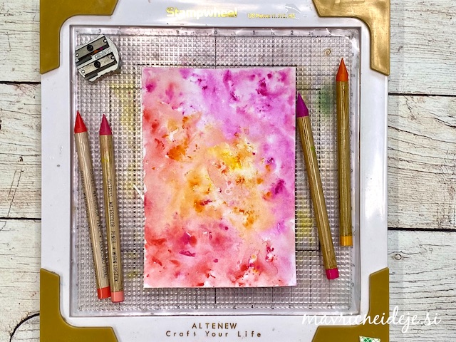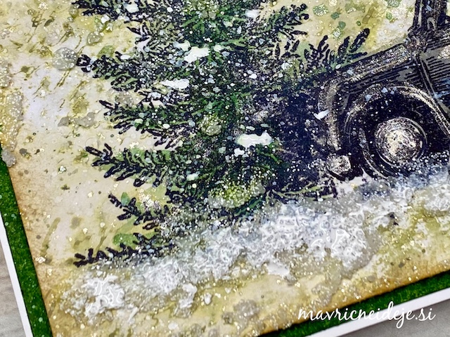 S tehniko ink smooshing sem izdelala ozadje na katerega sem s pahljačastim čopičem nanesla drobne kapljice. Nekaj plasti sem nanašala mokro na mokro, nekaj pa mokro na suho. Tako nastanejo zanimivi vzorci, kjer se nekatere plasti prelijejo, druge pa imajo ostre robove.