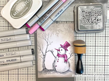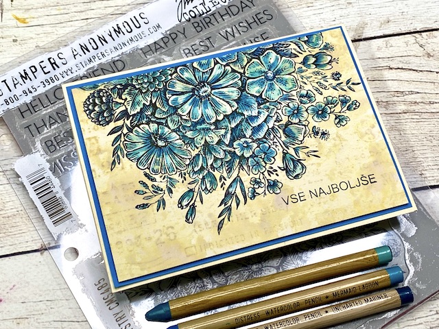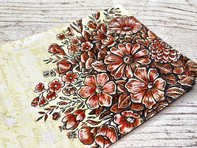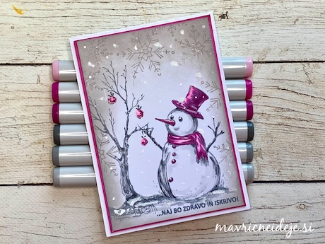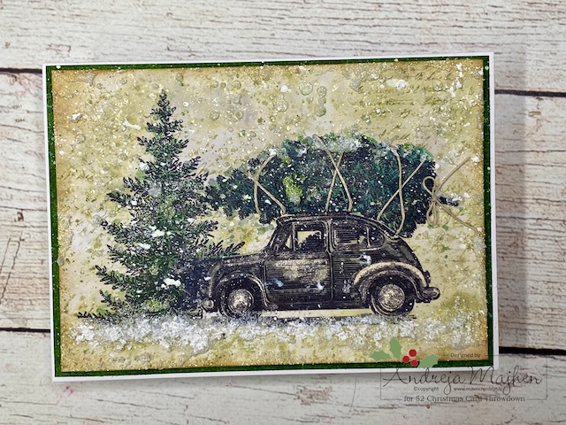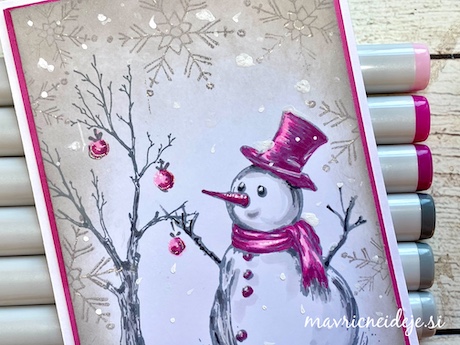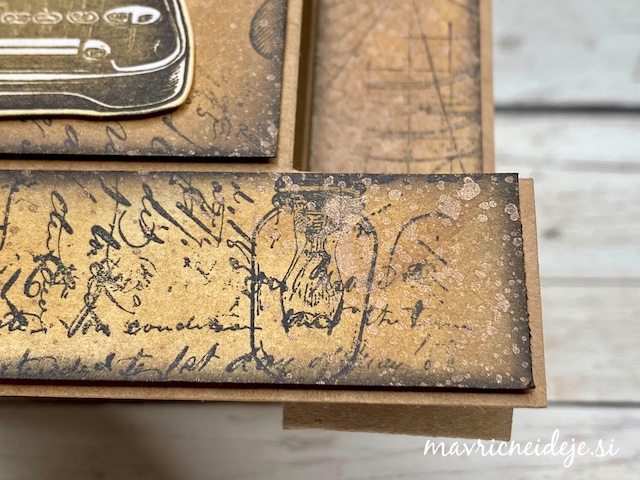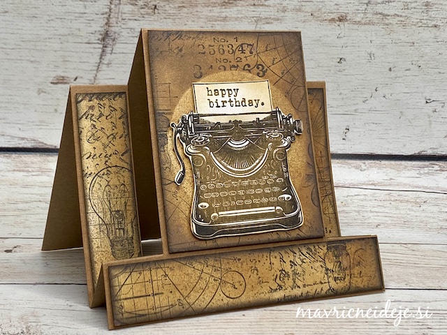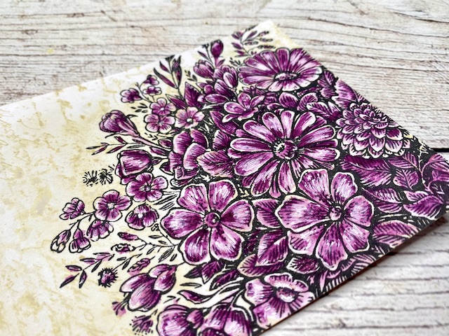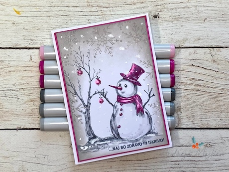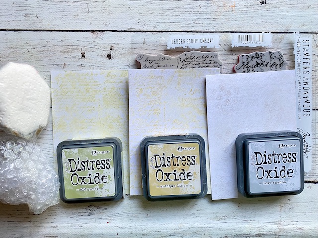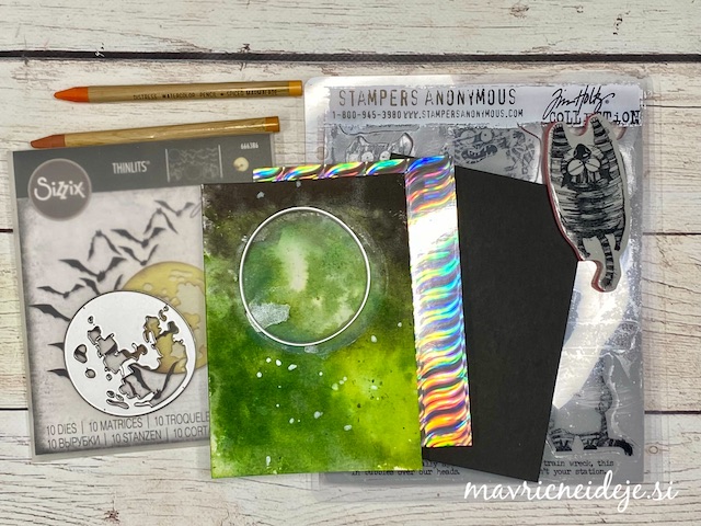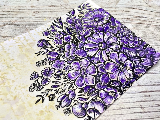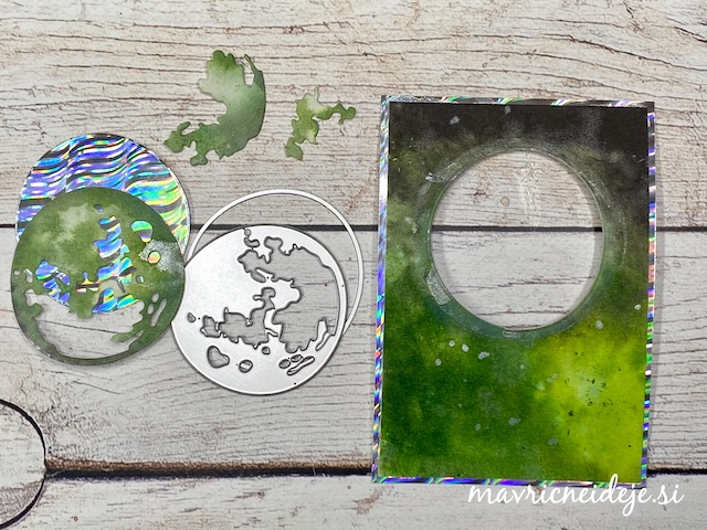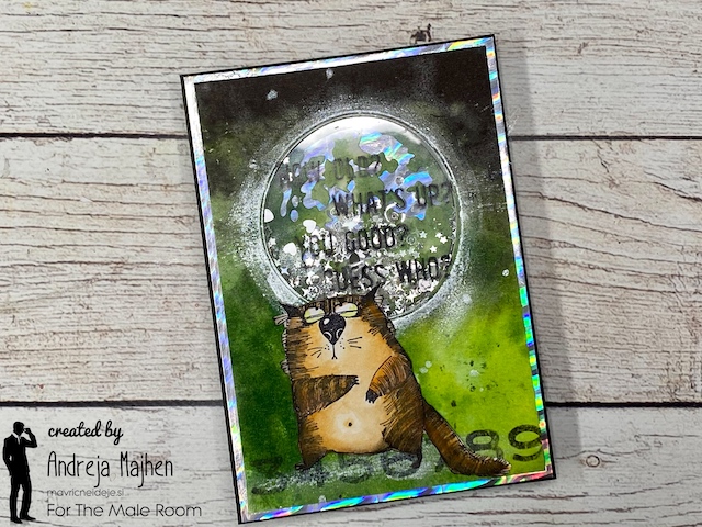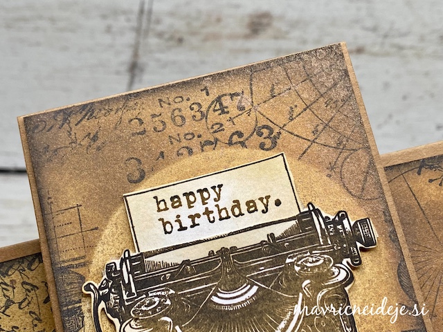 S tehniko ink smooshing sem izdelala ozadje na katerega sem s pahljačastim čopičem nanesla drobne kapljice. Nekaj plasti sem nanašala mokro na mokro, nekaj pa mokro na suho. Tako nastanejo zanimivi vzorci, kjer se nekatere plasti prelijejo, druge pa imajo ostre robove.
