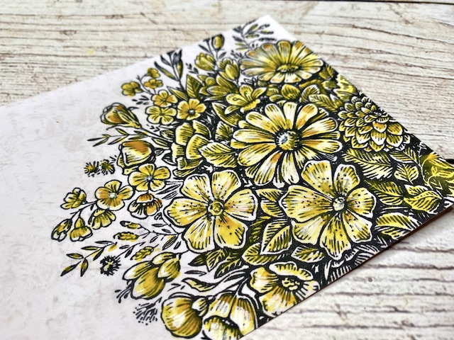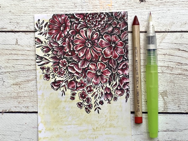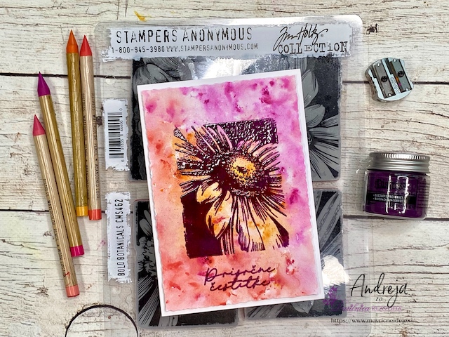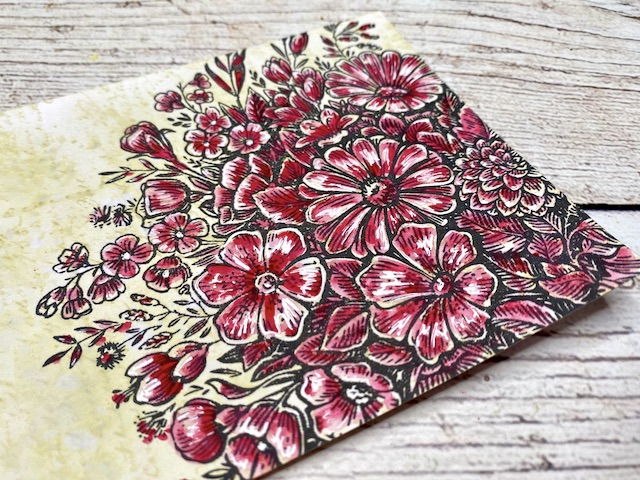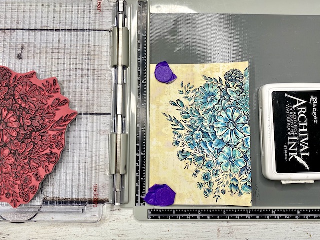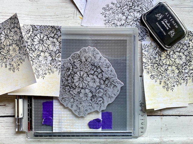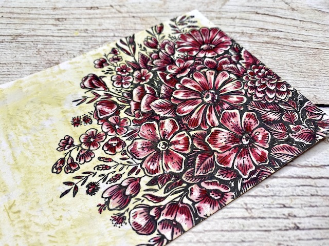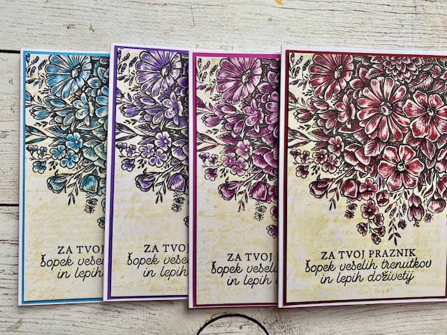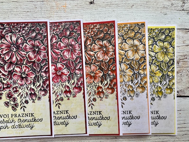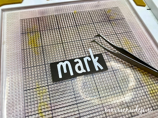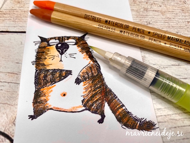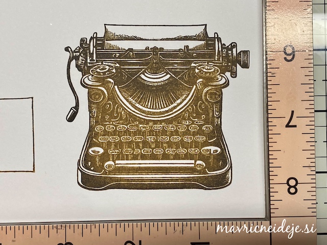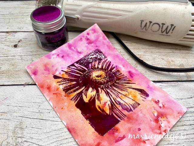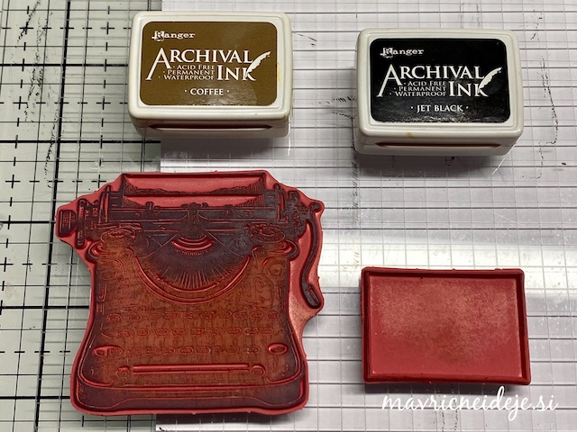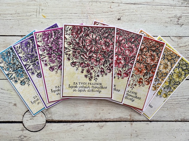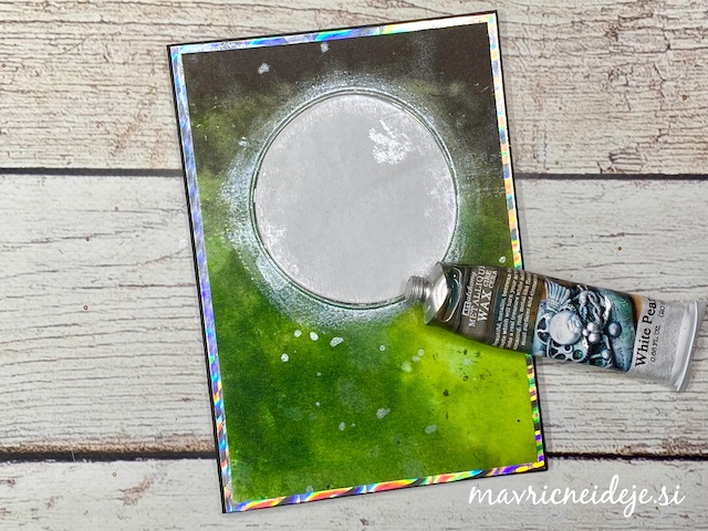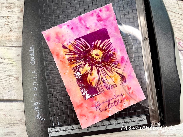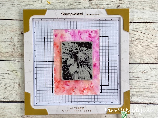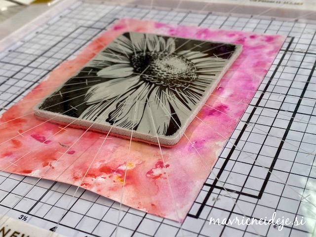 Z vodoodporno blazinico sem na suho ozadje odtisnila motiv in ga med barvanjem pustila kar v pripomočku za odtise. Motiv sem ponovno odtisnila, ko so bile barve čisto suhe.