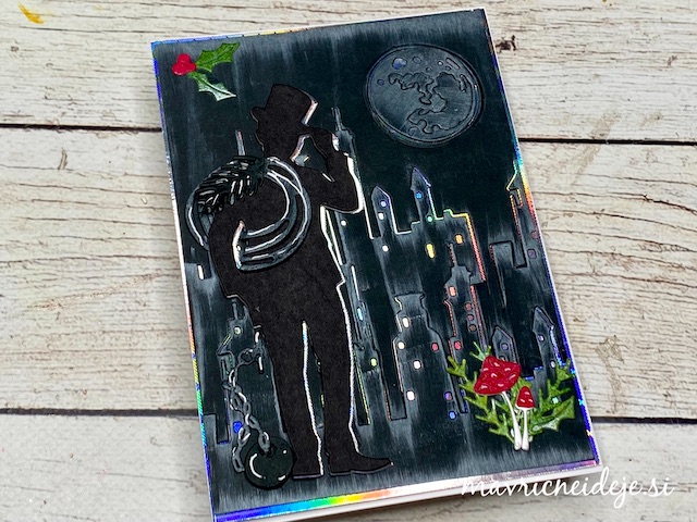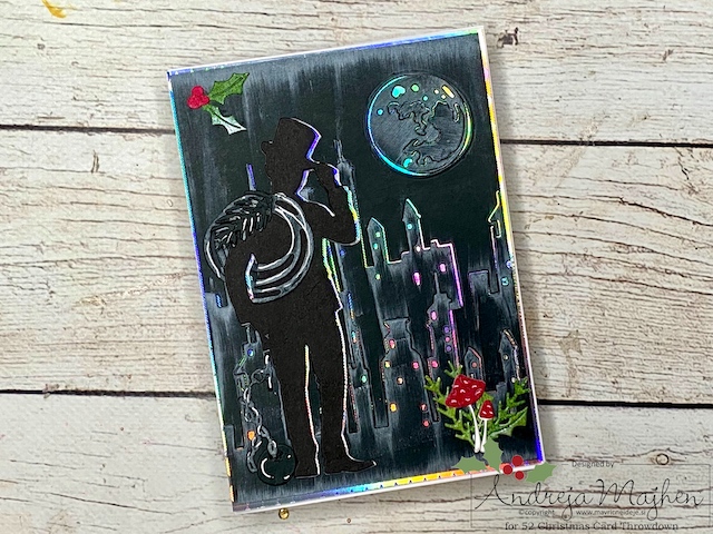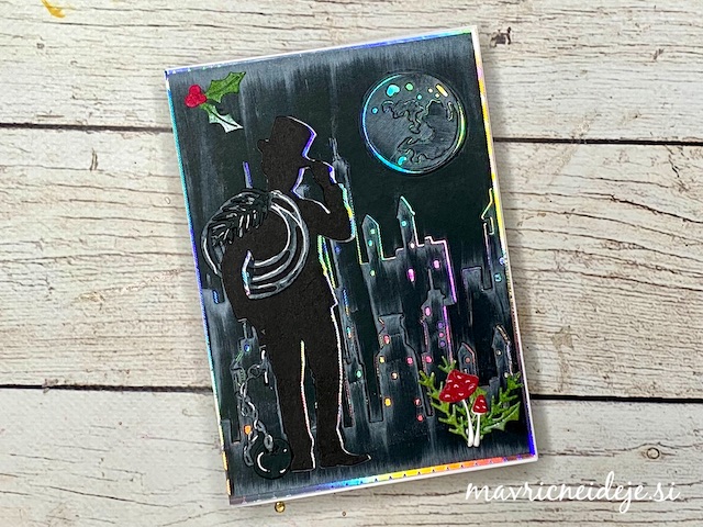 S tehniko ink smooshing sem izdelala ozadje na katerega sem s pahljačastim čopičem nanesla drobne kapljice. Nekaj plasti sem nanašala mokro na mokro, nekaj pa mokro na suho. Tako nastanejo zanimivi vzorci, kjer se nekatere plasti prelijejo, druge pa imajo ostre robove.