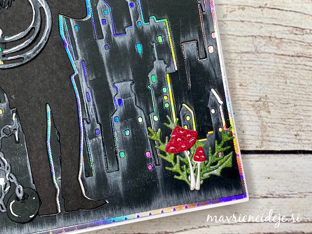 Z vodoodporno blazinico sem na suho ozadje odtisnila motiv in ga med barvanjem pustila kar v pripomočku za odtise. Motiv sem ponovno odtisnila, ko so bile barve čisto suhe.