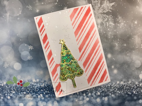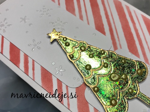Potem sem po enakem postopku naredila odtis še na zelen papir s teksturo in tudi ta je zelo lepo uspel. Perfect pearl prah sem nato učvrstila z nežno vodno meglico, za kar je Spellbindersova pršilka idealna.