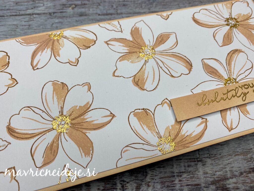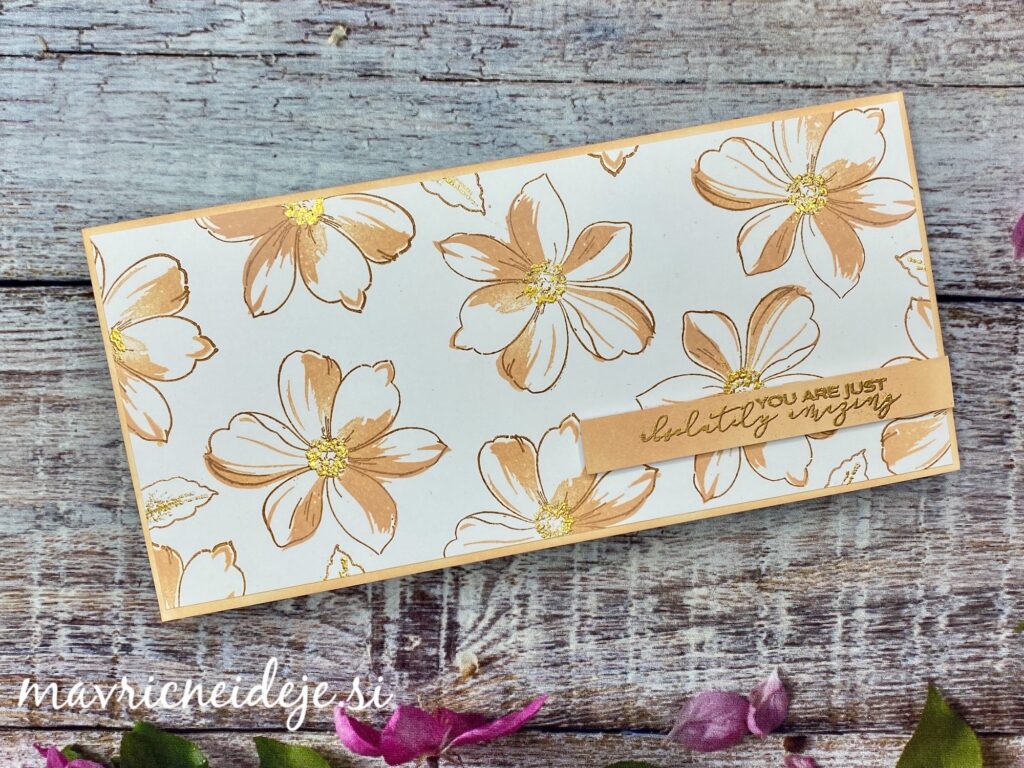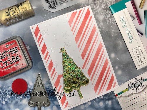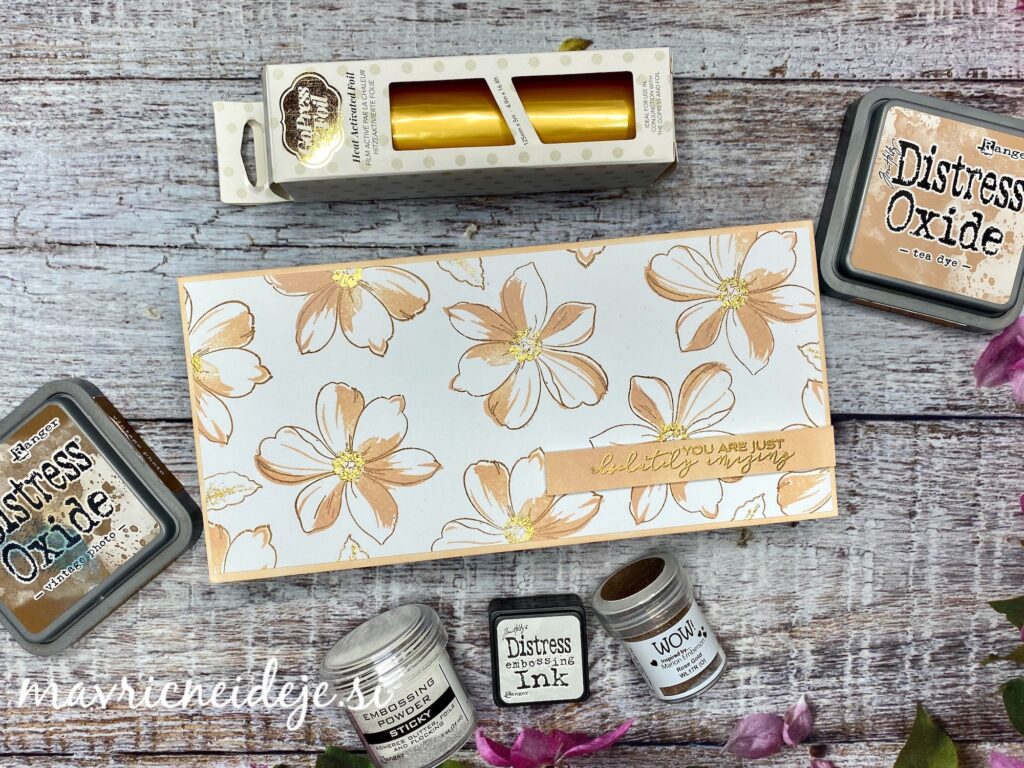 Tokrat sem stestirala ploščo za nanos folije (hot foil) kot štampiljko in izdelala voščilnico v zlato turkiznih barvah.