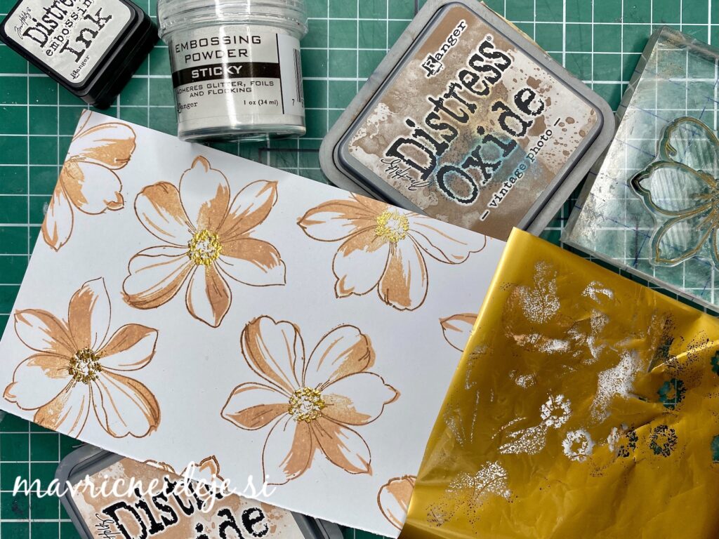 Nato sem vzela turkizen papir in ploščo za folijo premazala z embosing blazinico. Odtis sem nato embosirala z zlatim prahom.