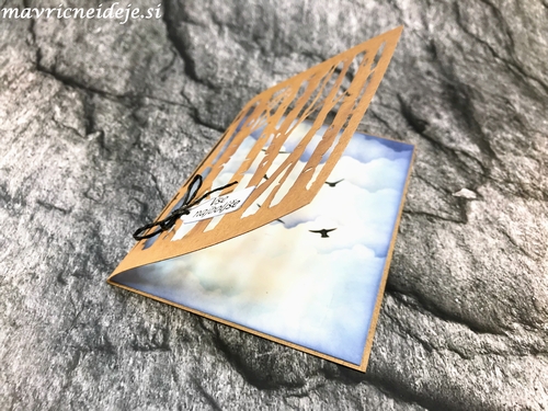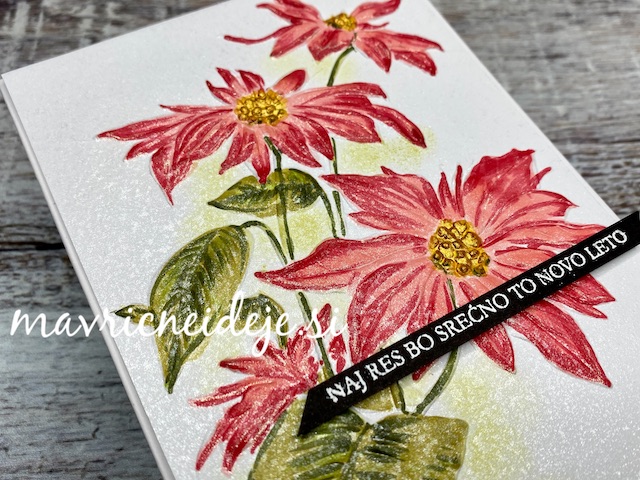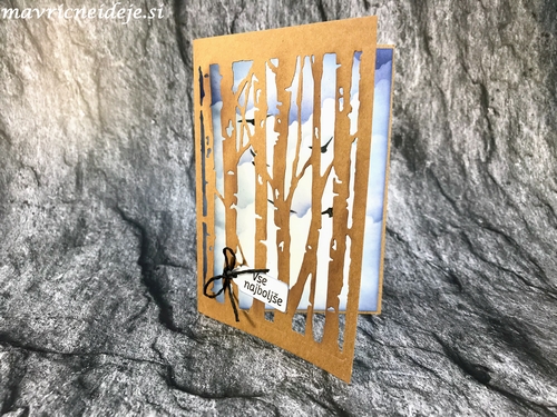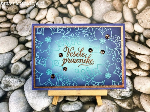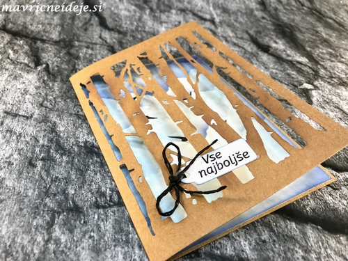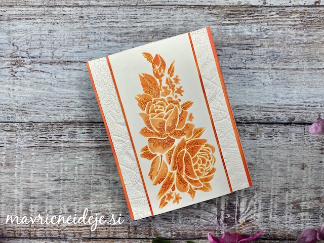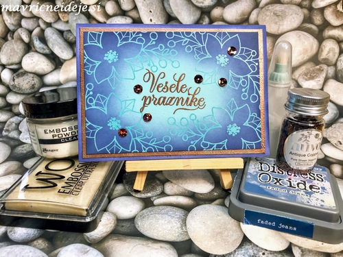 Z Distress oxide crackling campfire sem obarvala tudi robove osnove za voščilnico in rob kartončka, na katerem je motiv. Za dodatno teksturo sem uporabila Sizzix 3d teksturno ploščo z motivom listne površine (Sizzix 3D Leaf Veins).