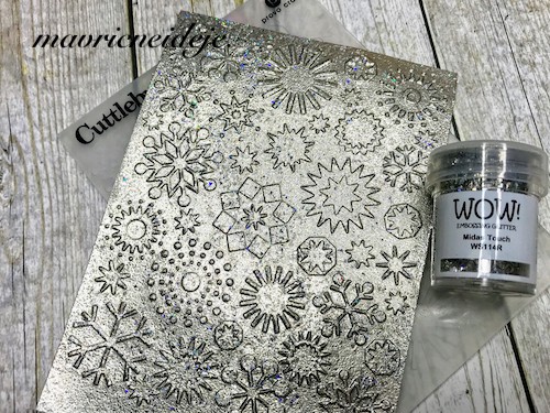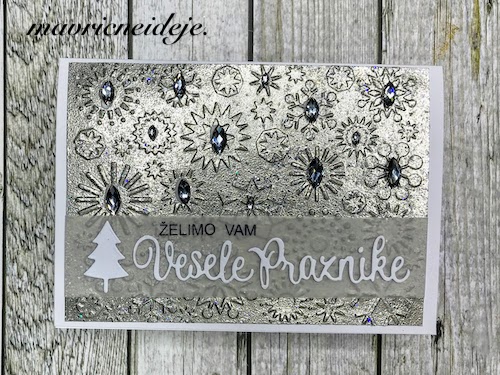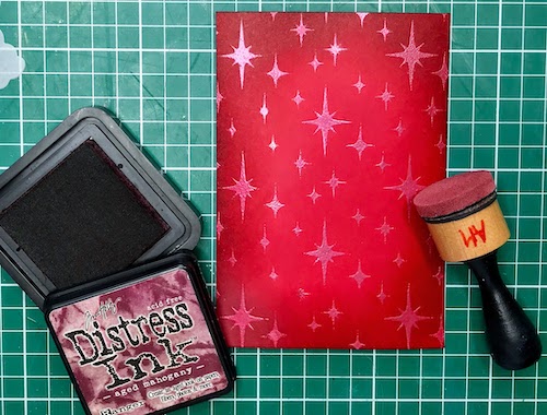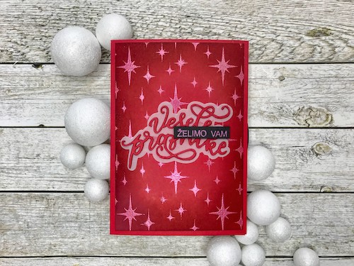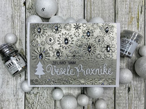 Preko stencil šablone sem enako, kot pri zeleni voščilnici nanesla Distress oxide crackling campfire, nato pa z lopatico še Nuvo glimmer pasto.