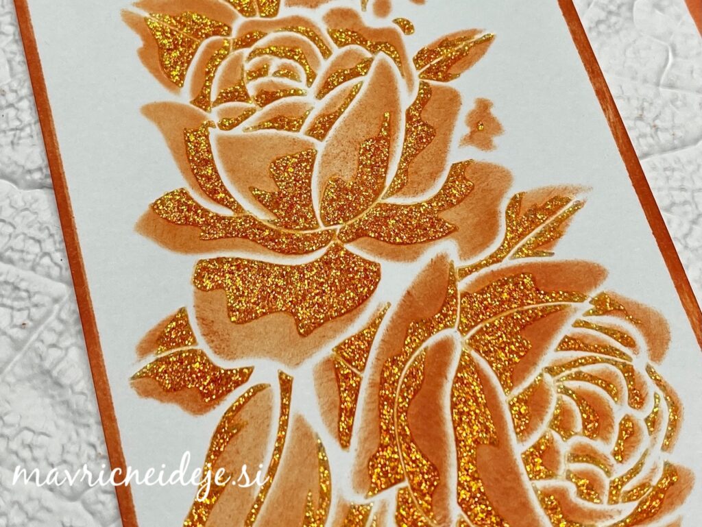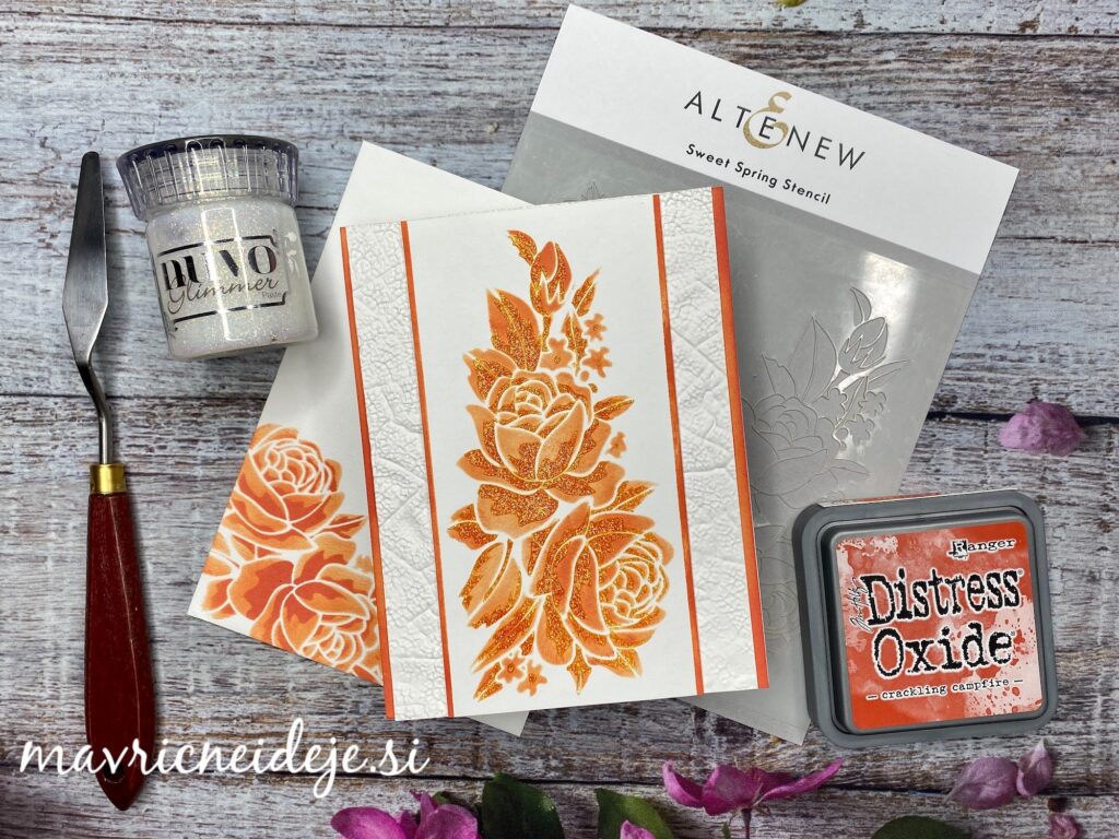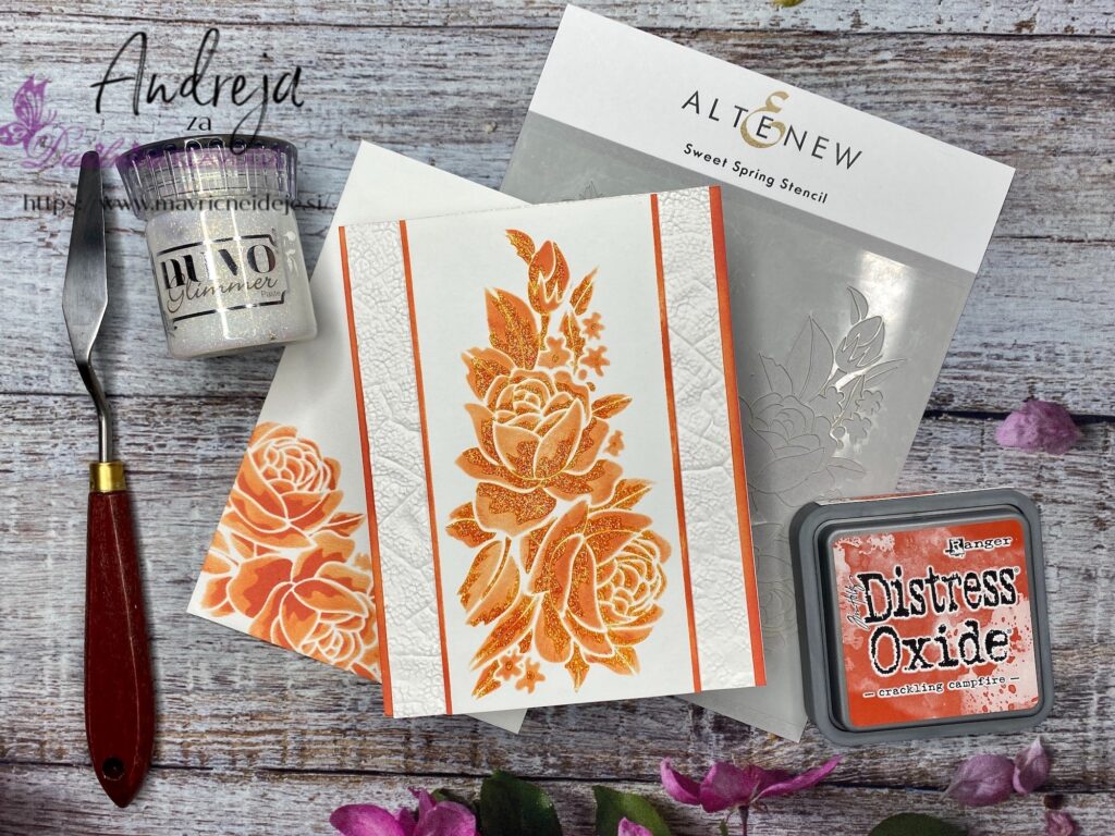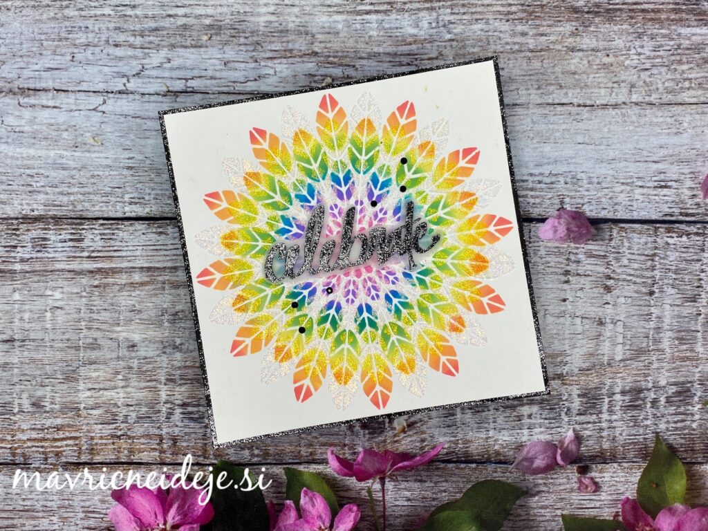 Altenew Sweet Spring Stencil šablona ima zelo veliko možnosti, da pri meni dobi prav poseben status, saj se ideje, kako jo uporabiti kar vrstijo. V AECP poglavju “Let it shine” imajo ravno bleščeči dodatku glavno vlogo, zato sem uporabila le eno barvno blazinico in pasto z bleščicami.