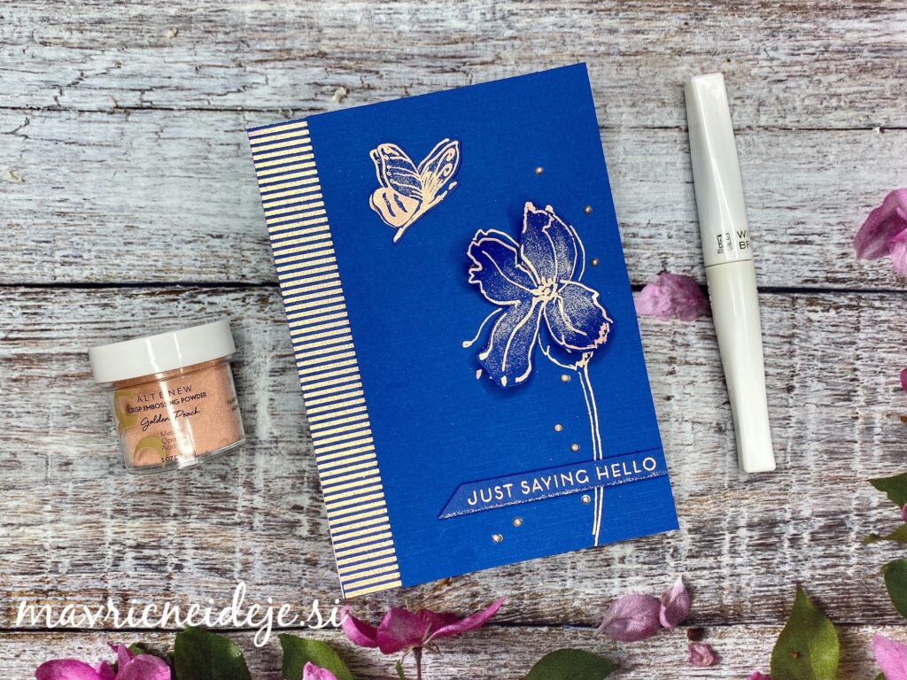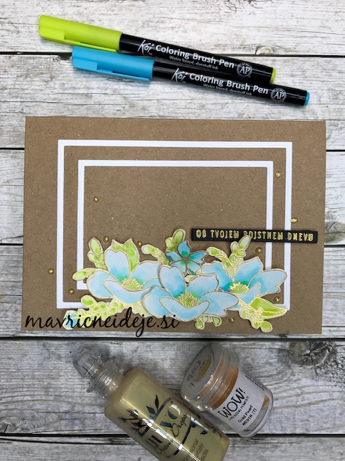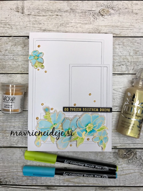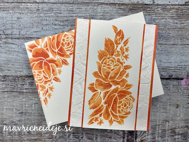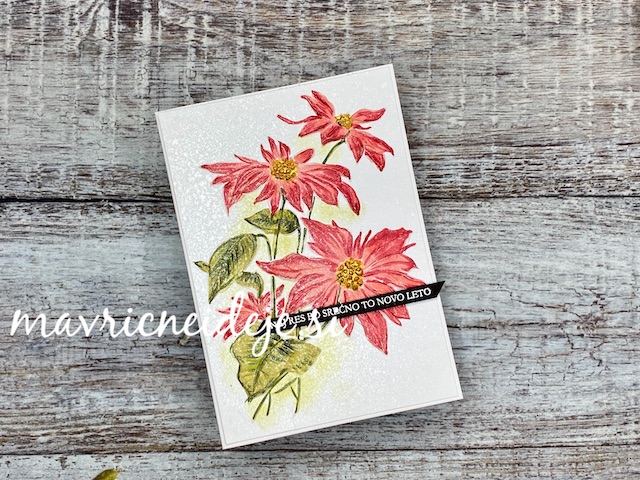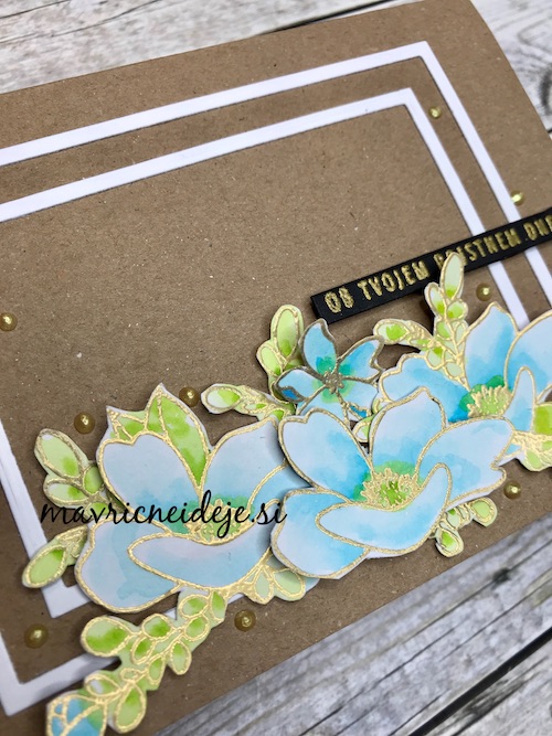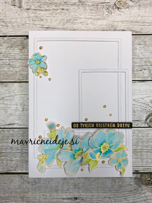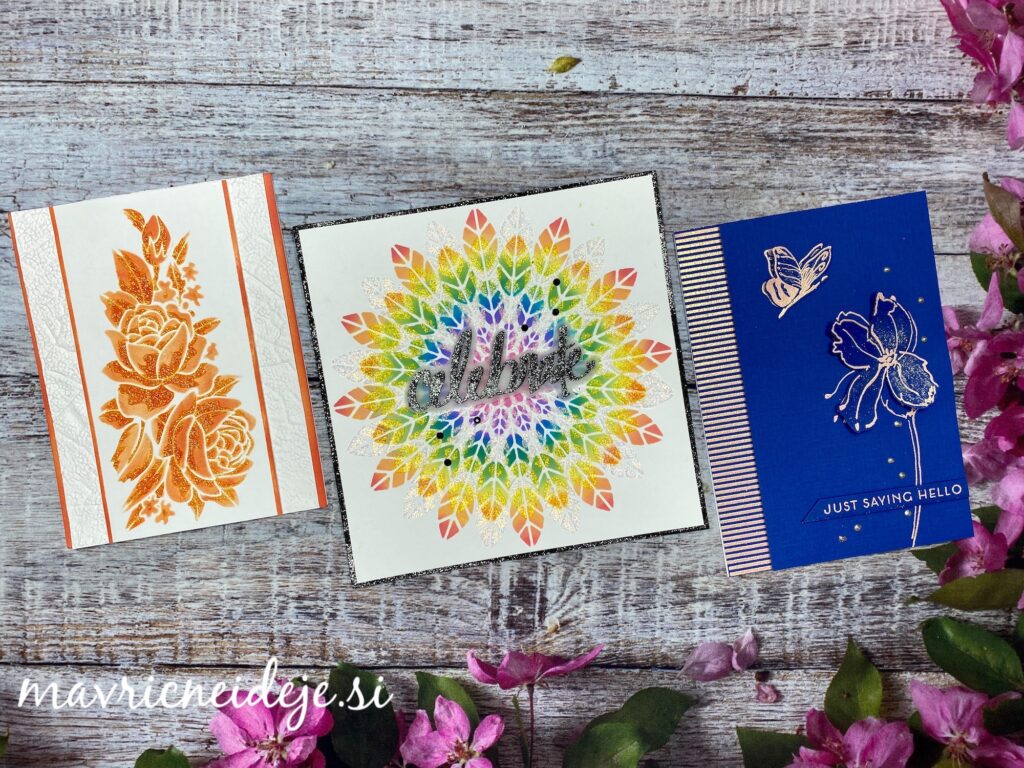 Altenew Sweet Spring Stencil šablona ima zelo veliko možnosti, da pri meni dobi prav poseben status, saj se ideje, kako jo uporabiti kar vrstijo. V AECP poglavju “Let it shine” imajo ravno bleščeči dodatku glavno vlogo, zato sem uporabila le eno barvno blazinico in pasto z bleščicami.