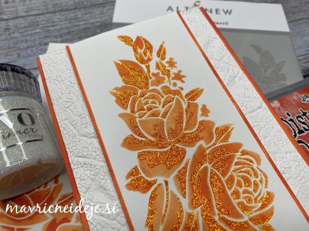 Preko stencil šablone sem enako, kot pri zeleni voščilnici nanesla Distress oxide crackling campfire, nato pa z lopatico še Nuvo glimmer pasto.
