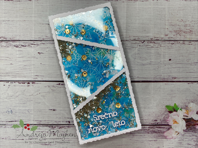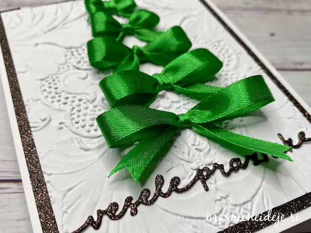 Uporabila sem komplet letterpress plošče in pripadajočih stencil šablon ter izdelala voščilnico z bleščeče zelenim ozadjem in vijola cvetovi.