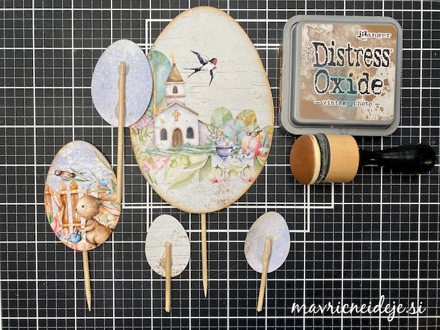 Motiv sem s črno blazinico odtisnila na papir in ga pobarvala z Distress barvicami. Nato sem ga izrezala s škarjami in postavila v košarico.