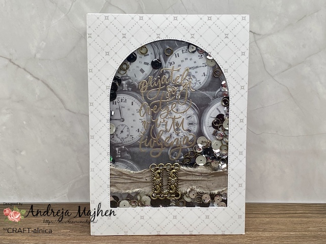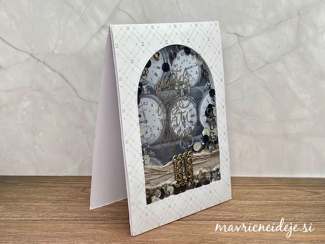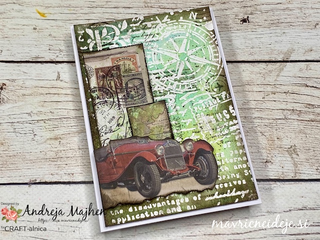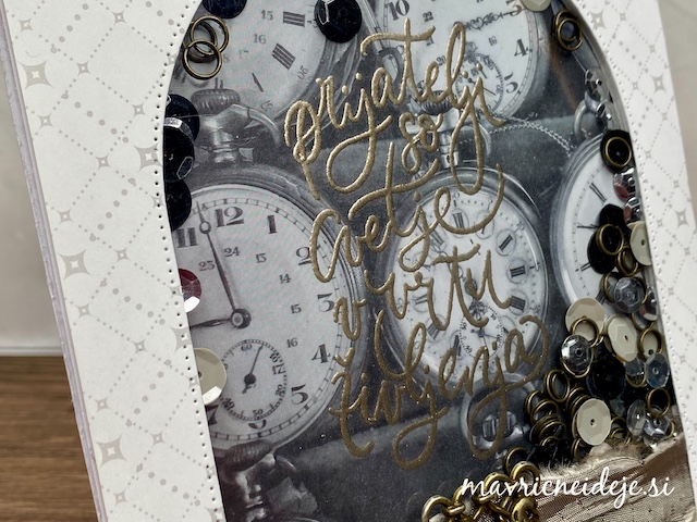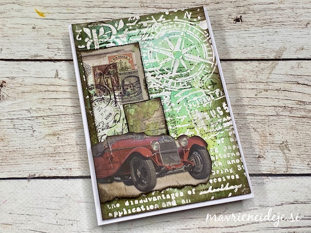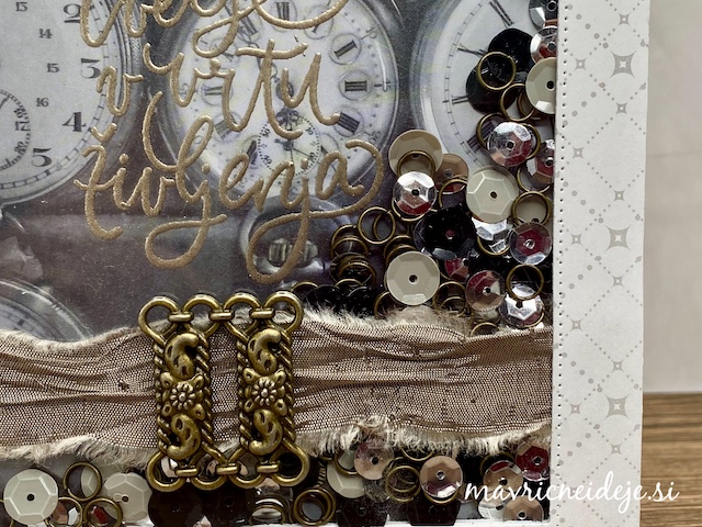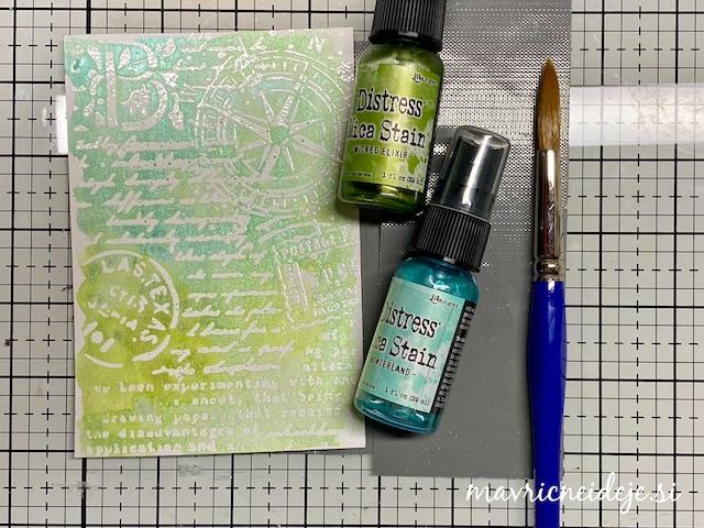 S tehniko ink smooshing sem izdelala ozadje na katerega sem s pahljačastim čopičem nanesla drobne kapljice. Nekaj plasti sem nanašala mokro na mokro, nekaj pa mokro na suho. Tako nastanejo zanimivi vzorci, kjer se nekatere plasti prelijejo, druge pa imajo ostre robove.