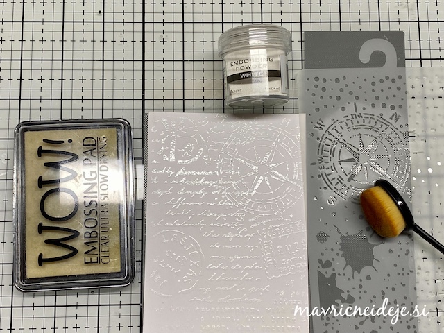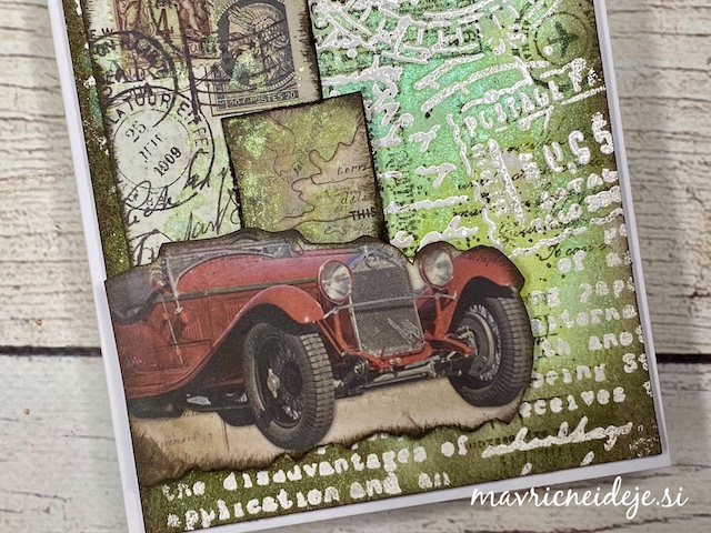 Z vodoodporno blazinico sem na suho ozadje odtisnila motiv in ga med barvanjem pustila kar v pripomočku za odtise. Motiv sem ponovno odtisnila, ko so bile barve čisto suhe.