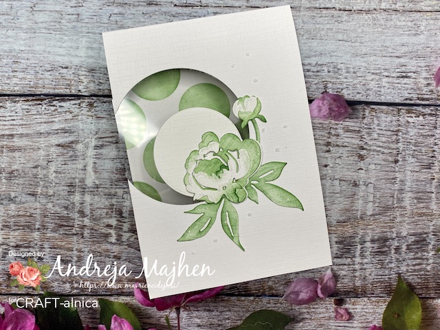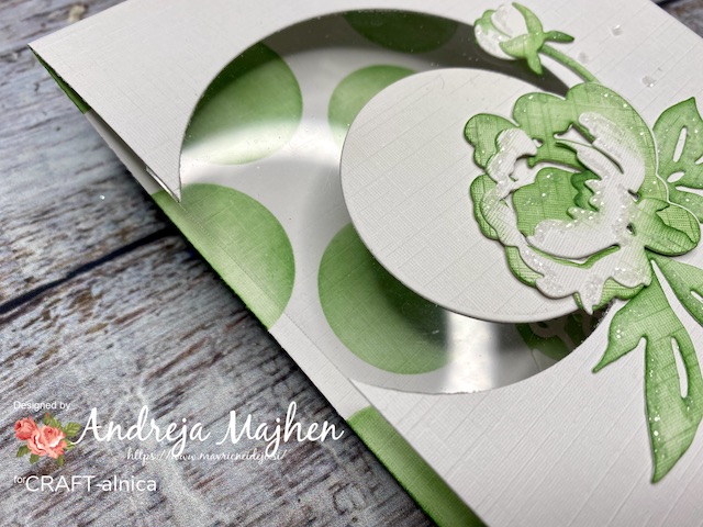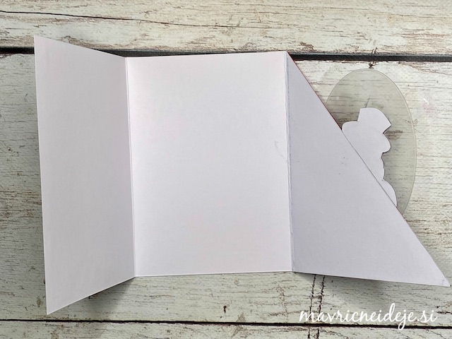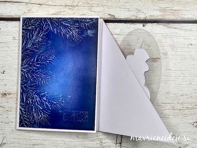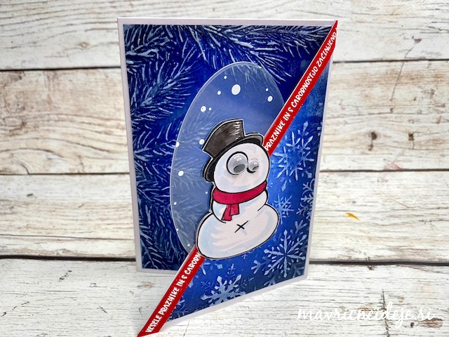 Voščilnica je tridelna s prozornim ovalom za ozadje snežkota.