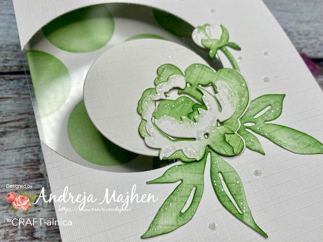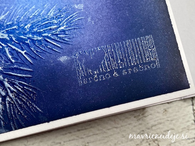 Z valjčkom sem nanesla belo barvo nato pa vse embosirala s prozornim prahcem, zato so vejice in snežinke videti zaledenele.