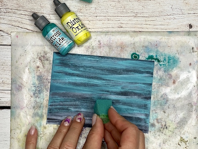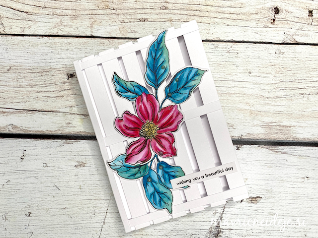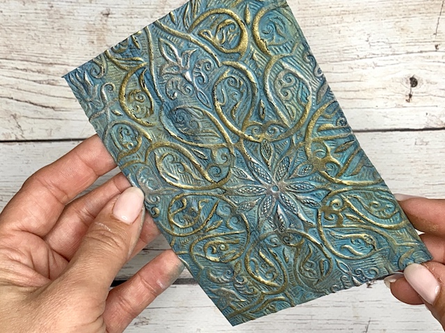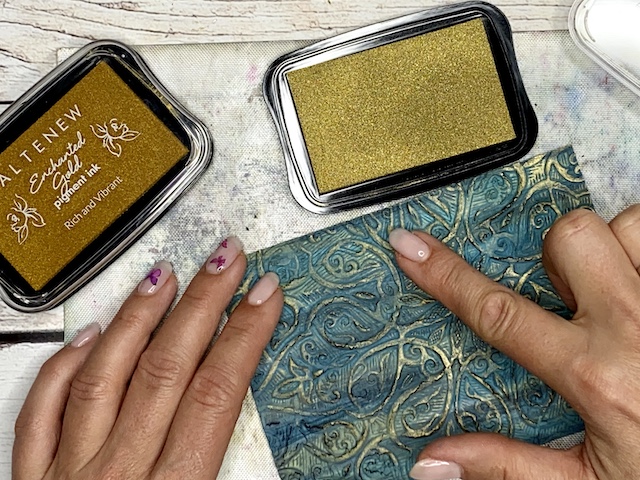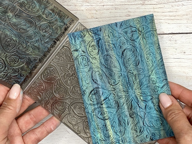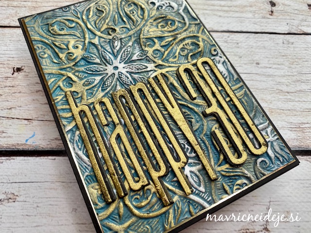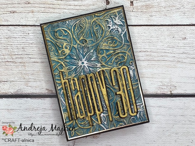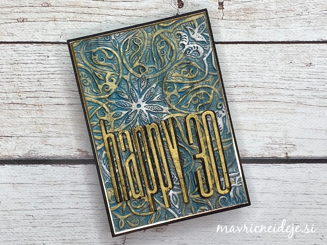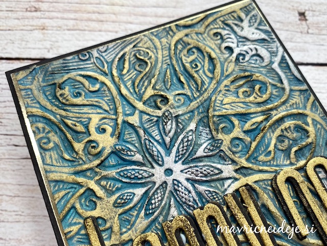 Motiv sem z vodobstojno blazinico odtisnila na akvarelni papir in ga pobarvala bleščečimi barvami: Distress mica stain. Nato pa embosirala v teksturni srajčki.