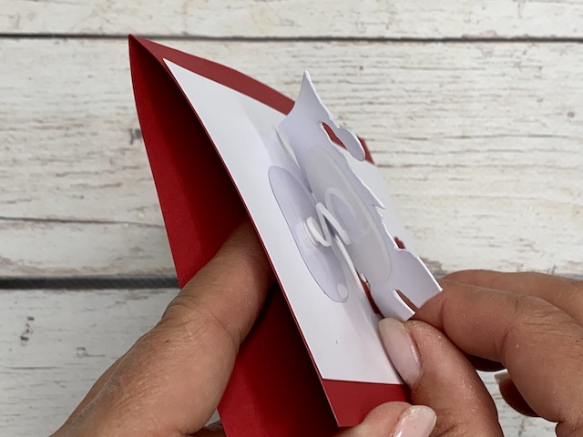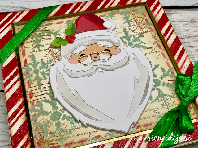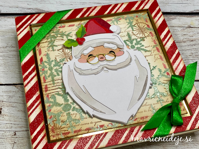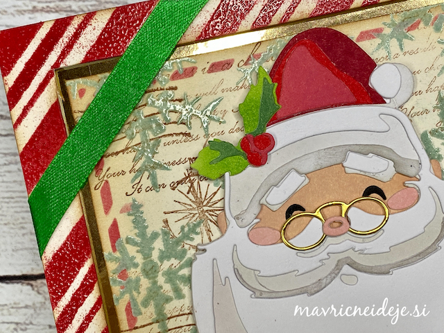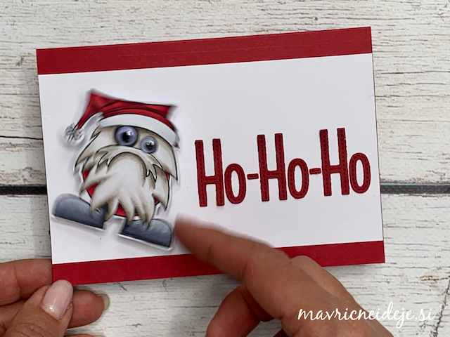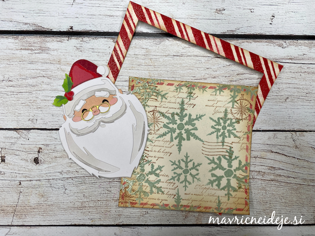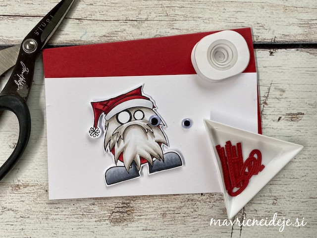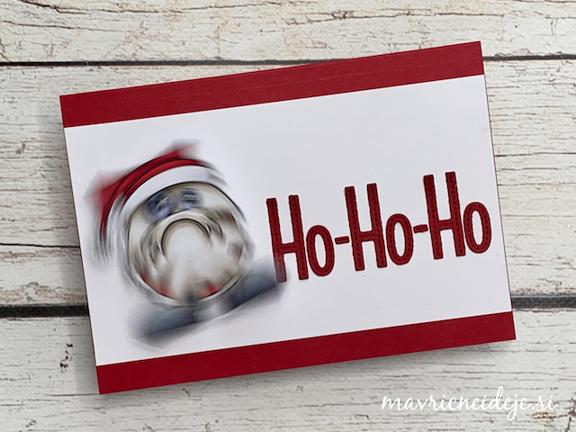 Izrez podkve iz zlatega papirja sem uporabila za okvir lesenih vrat, pred katerimi ponosno stoji mini Božiček.