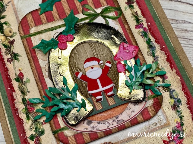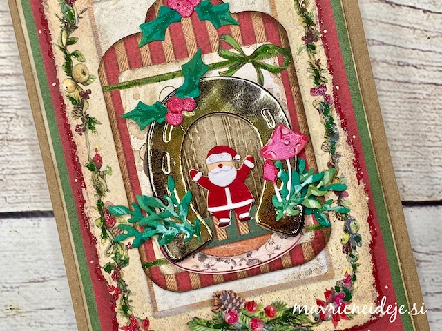 Izrez podkve iz zlatega papirja sem uporabila za okvir lesenih vrat, pred katerimi ponosno stoji mini Božiček.