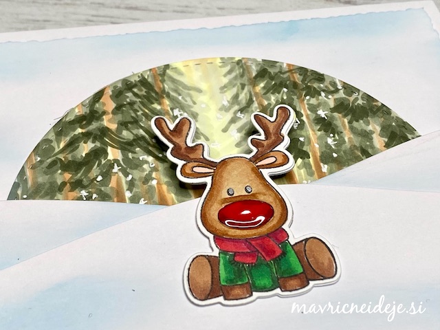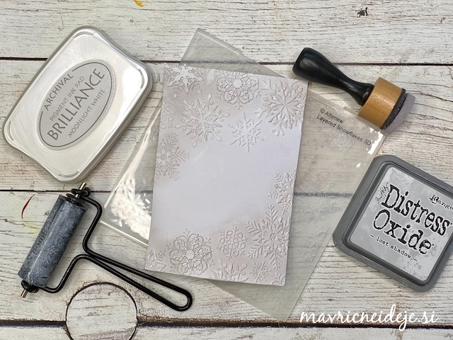 S pripomočkom za natančne odtise sem s tehniko maskiranja sestavila osrednji motiv. Uporabila sem alkoholnim markerjem prijazno Nuvo hibridno blazinico.