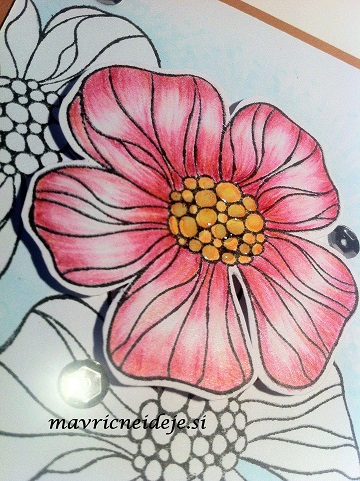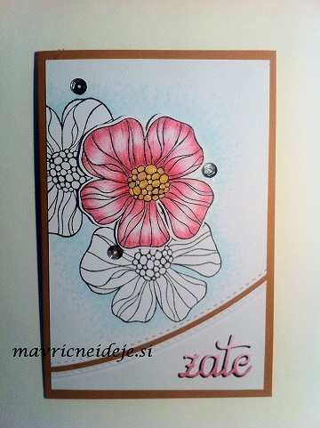 Tokrat sem se preizkusila v tehniki odvzemanja barve z ozadja. Najprej sem na mixed media papir nanesla Distress Oxide v jesenskih odtenkih in to s “podganco” dobo osušila. Na suho podlago sem z zlatim embossing prahom embosirala odtise Altenew štampiljke. Nato sem s čopičem na področja okoli cvetov nanesla izdatno količino vode in jo po nekaj trenutkih popivnala s papirnato brisačko. Tako se je intenzivnost barve močno zmanjšala.