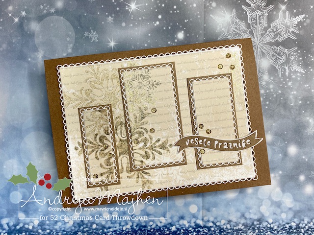 Za ozadje sem uporabila akvarelni papir in se ga po Tinino lotila z Distress ink Picked Raspberry in Salty Ocean. Za snežinke in hribček sem preko plastične šablone nanesla mešanico Viva Inka Gold Platinum barve in bele teksturne paste. Tudi Rudi je oživel z Distresi: Vintage Photo, Graund Epreso in Picked Raspbery. Izrez srečno se blešči zaradi Viva Inka Gold Platinum.