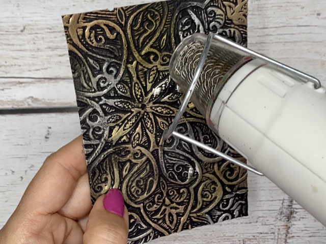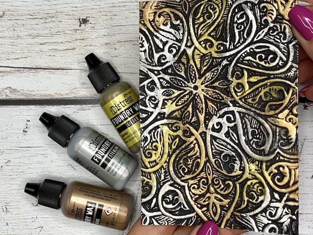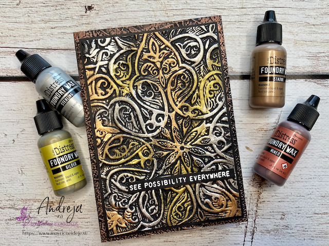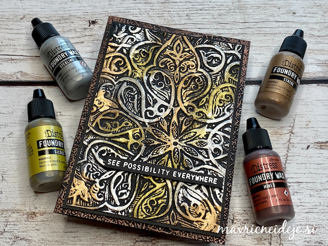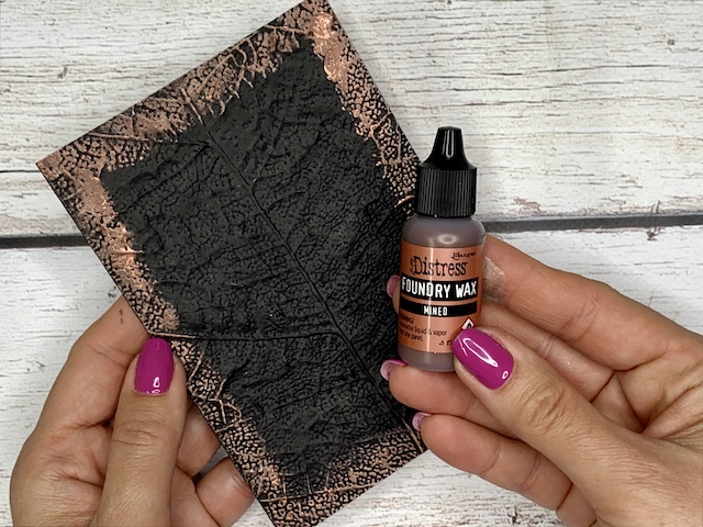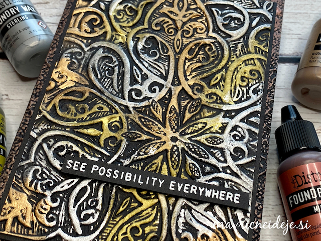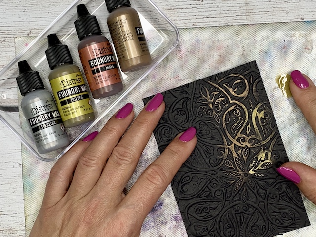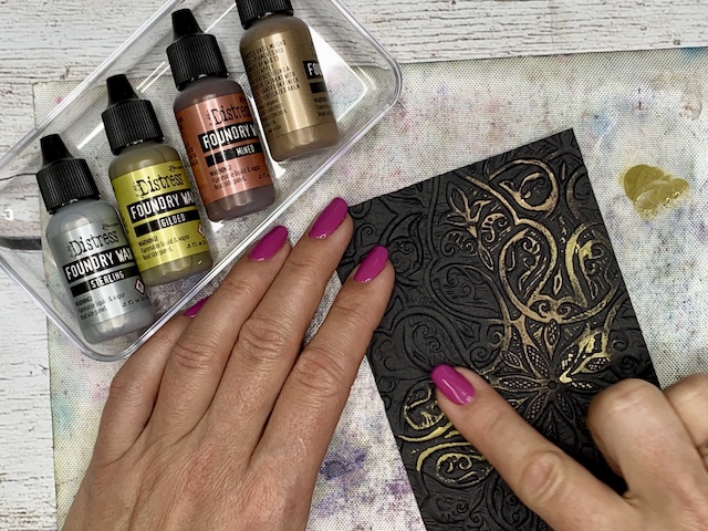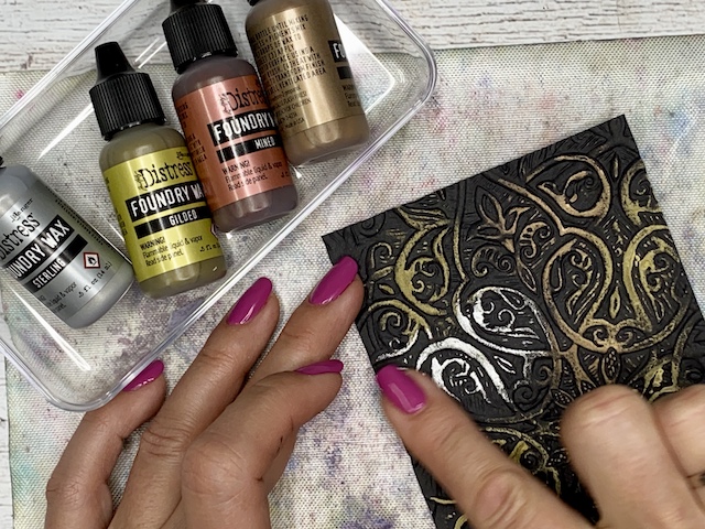 Na embosiran papir to sem kar s prstom nanesla Distress Foundry Wax. To so tekoči voski, ki jih na porozne in neporozne površine najlažje nanašamo s prstom in za zaključek nujno pogrejemo z vročo pištolo.