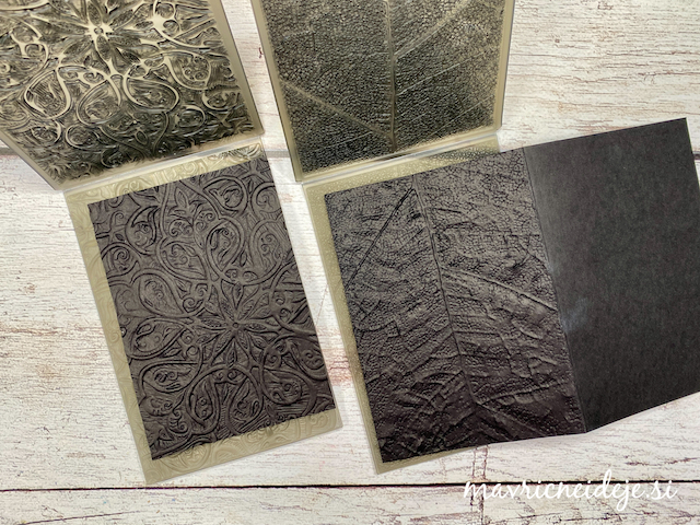Za tokratno voščilnico sem izbrala dve embosing srajčki: Sizzix engraved in leaf veins v katerih sem embosirala polovico osnove za voščilnico in en papir.