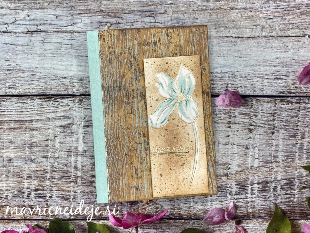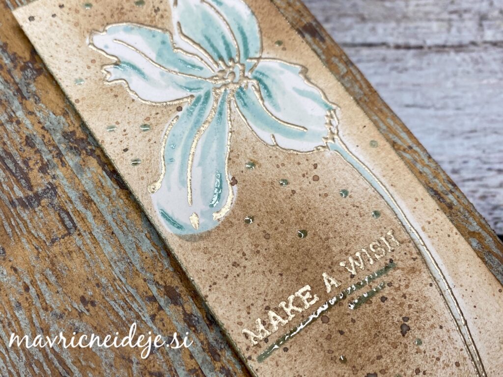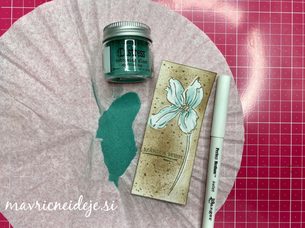 Z embosing pisalom sem dorisala nekaj detajlov na v akvarelni tehniki pobarvanem cvetu in to embosirala z Distress glaze. Tudi na ozadje sem dodala glaze.