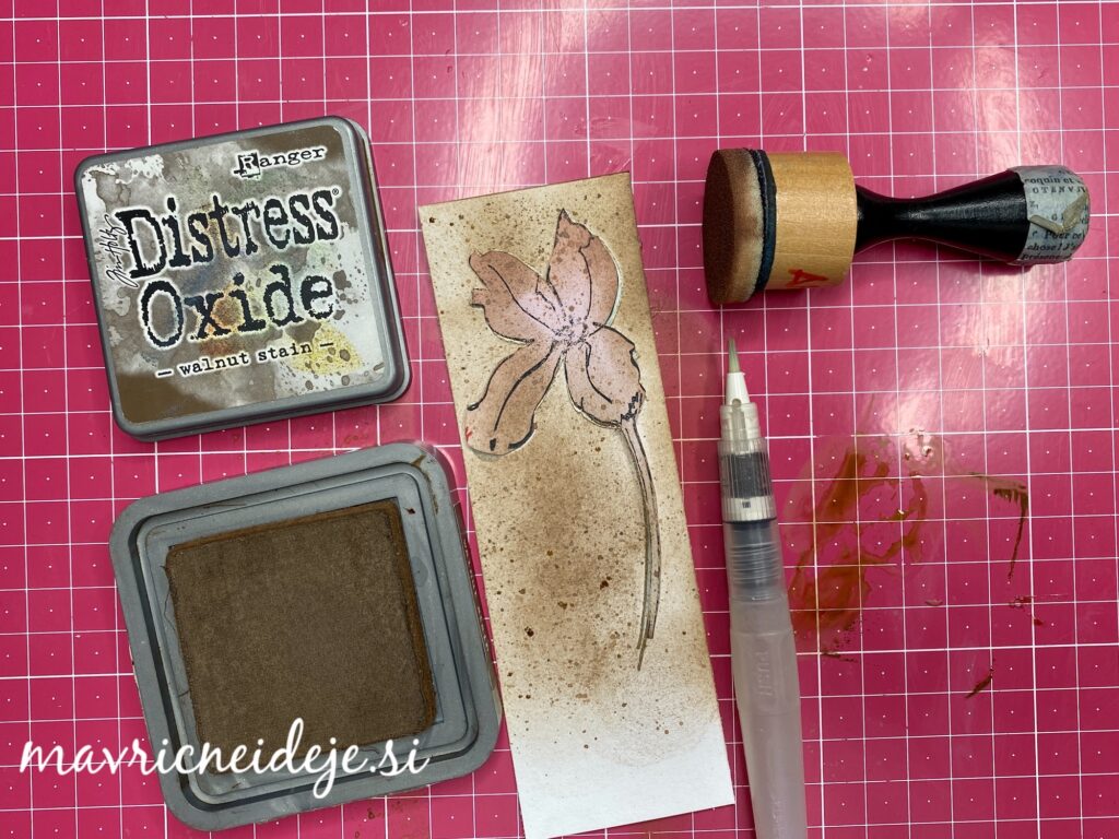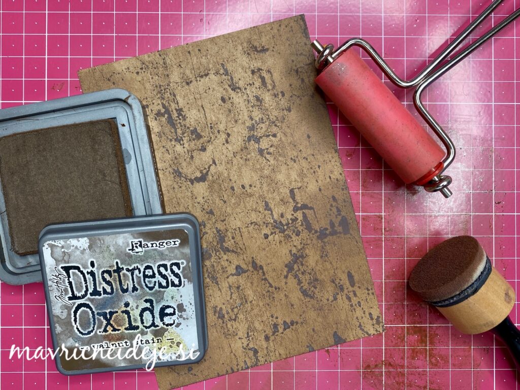 Na kraft papir sem z valjčkom nanesla z vodo razredčen Distress Oxide walnut stain, da so nastale nekakšne packe, nato sem dodala še nekaj barve z okroglim aplikatorjem. Tako pobarvan papir sem vstavila v embosirno srajčko Sizzix lumber in nastal je videz lesa.