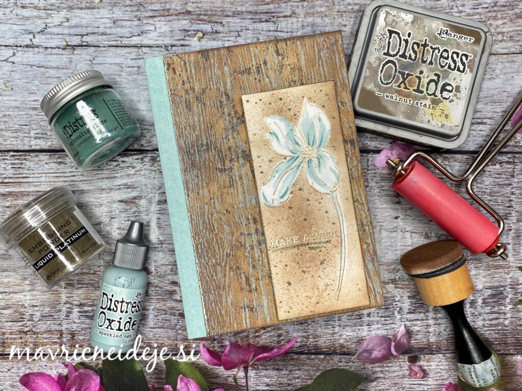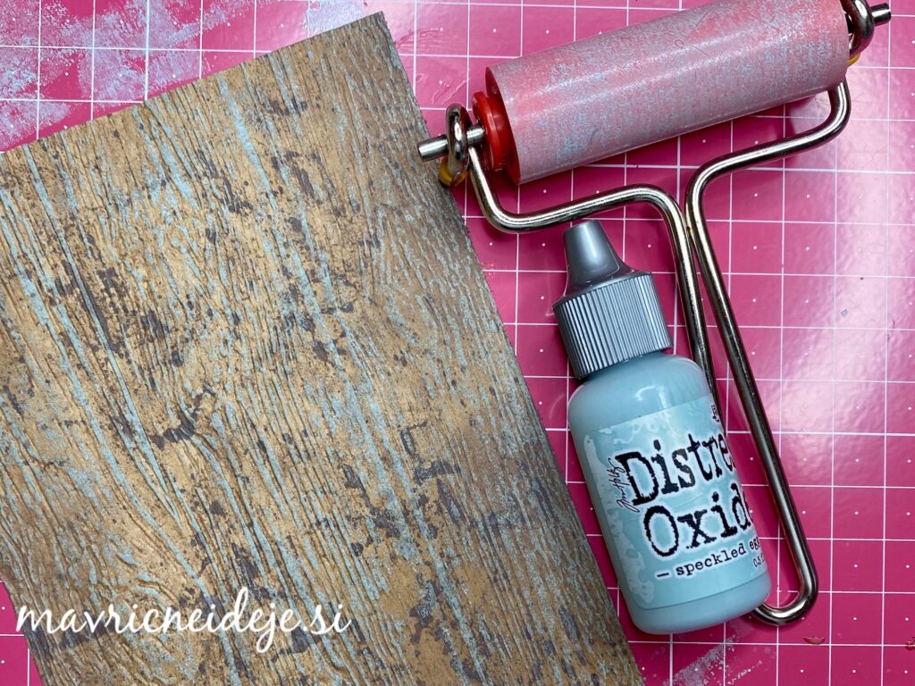 Z valjčkom sem na dvignjene brazde nanesla Distress Oxide speckled egg. Tako sem povdarila lesno teksturo.