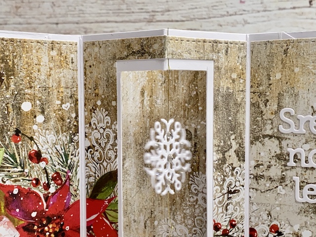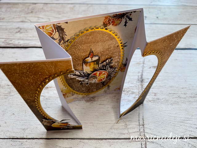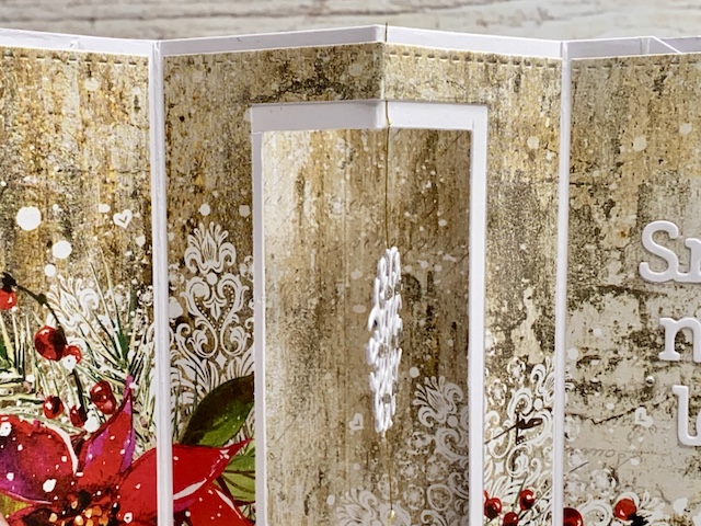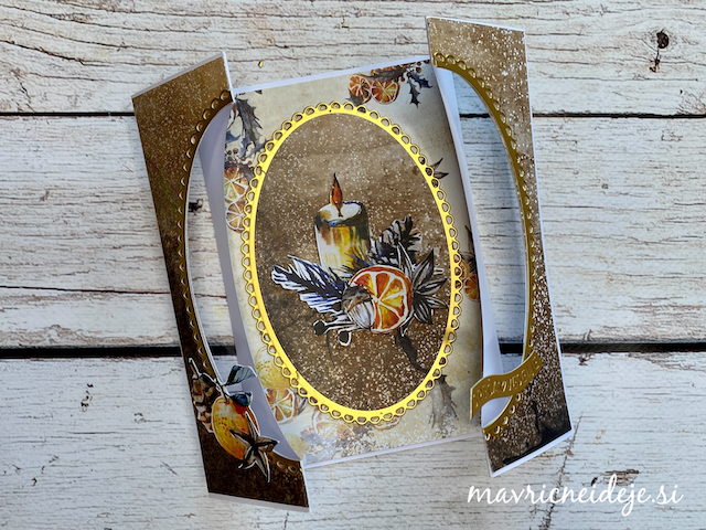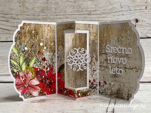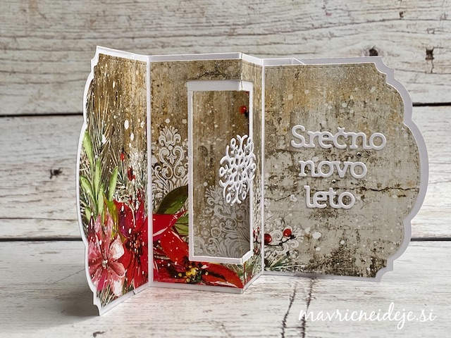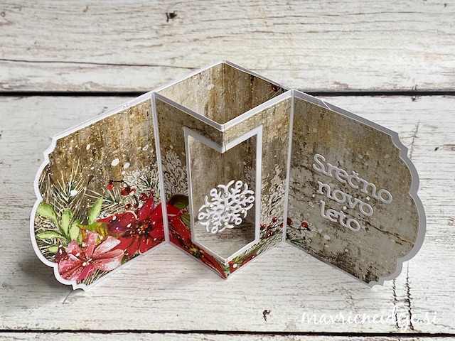 Zlat sukanec sem ujela med dve plasti snežinke in jo nalimala med potiskan in bel papir v sredino okna. Snežinka tako lebdi/visi in se ob odpiranju voščilnice lepo zavrti. Dodala sem še mini bleščice.