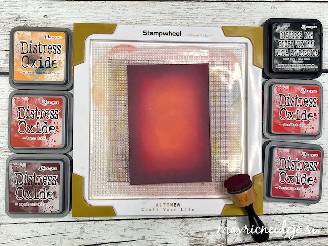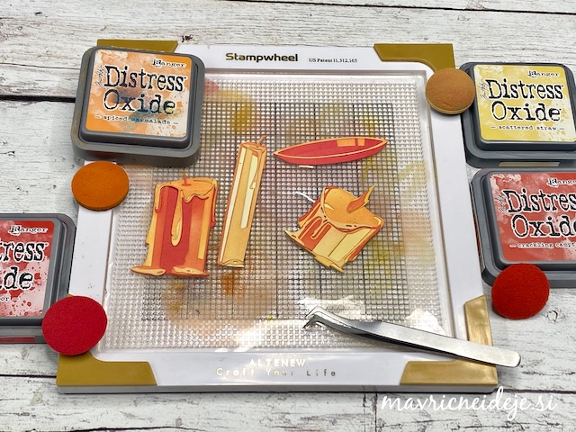 Za sestavljanje drobnih izrezov uporabljan lepljivo podlago, ki je del pripomočka za odtise Altenew Stampwheel. Drobni delci so na leplivi podlagi pri miru in se pri sestavljanju ne spodmikajo.