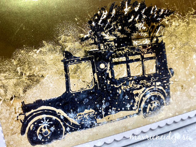 Osnova voščilnice se odpira kot “gate fold”, v sredini pa ima dodaten element, ki je pritrjen na levo in desno krilo osnove.