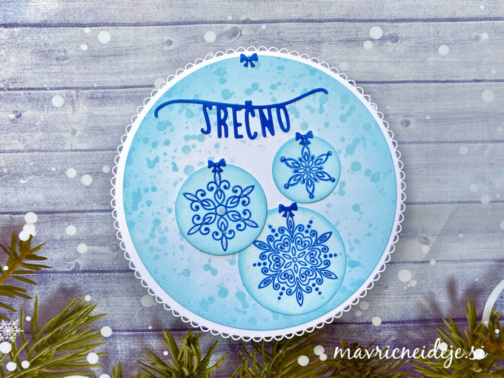 Iz belo perl papirja sem si pripravile veliko različnih izrezov snežink, ki sem ji nabrala iz različnih setov. Sestavila sem jih ve obliko smrečice in nato prilimala na ozadje s snežinkami.