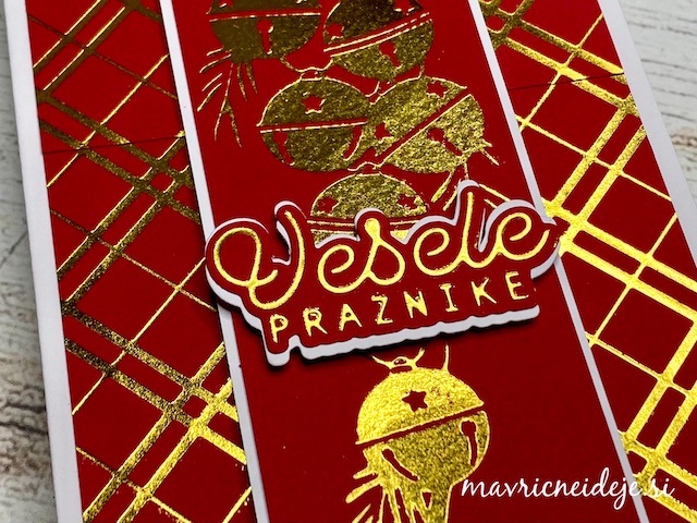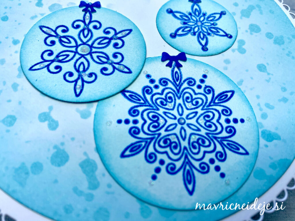 Iz belo perl papirja sem si pripravile veliko različnih izrezov snežink, ki sem ji nabrala iz različnih setov. Sestavila sem jih ve obliko smrečice in nato prilimala na ozadje s snežinkami.
