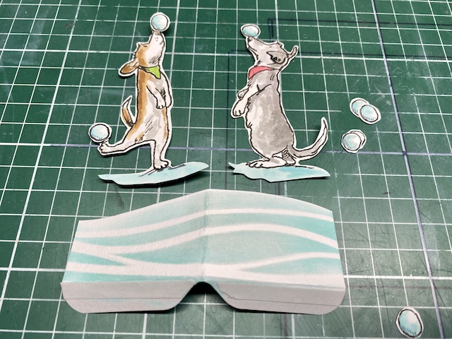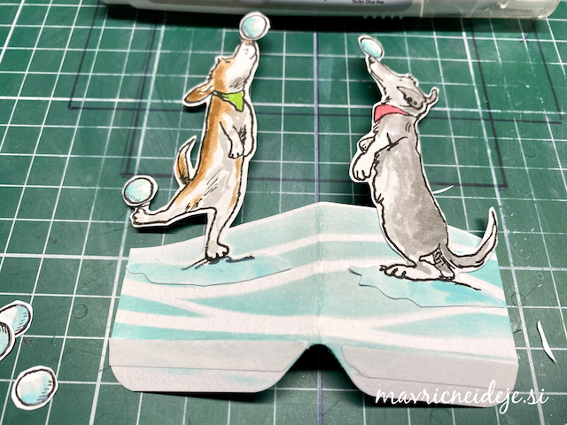 Lepilo nanesemo povsod, razen na pop up mehanizem in vstavilo v osnovo. Izreze metujev nalepimo na ozek trak prozorne folije.