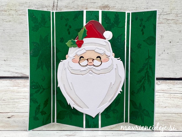 Na zelen papir sem odtisnila in embosirala motive zimskega zelenja in ta papir narezala na trakove, ki ustrezajo velikosti osnove.