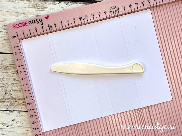 Za osnovo sem na papirju velikosti 21×14,7cm na daljši stranici naredila prepogibe na 4,5cm; 5cm; 9,5cm; 11,5cm; 16cm in 16,5cm.