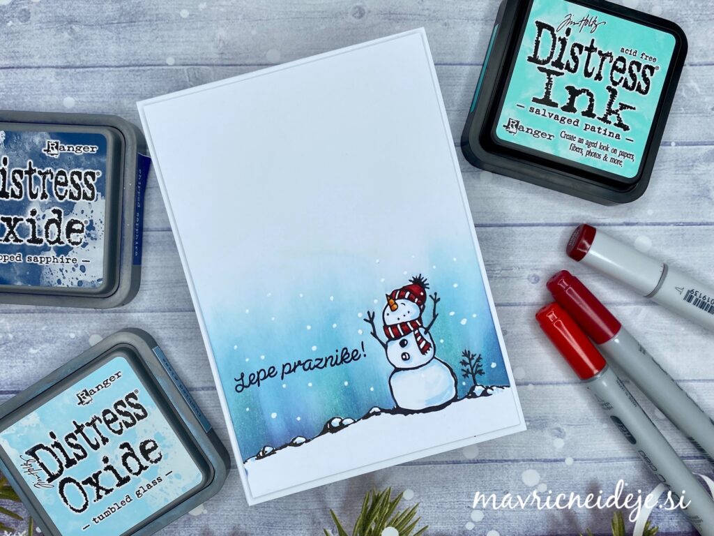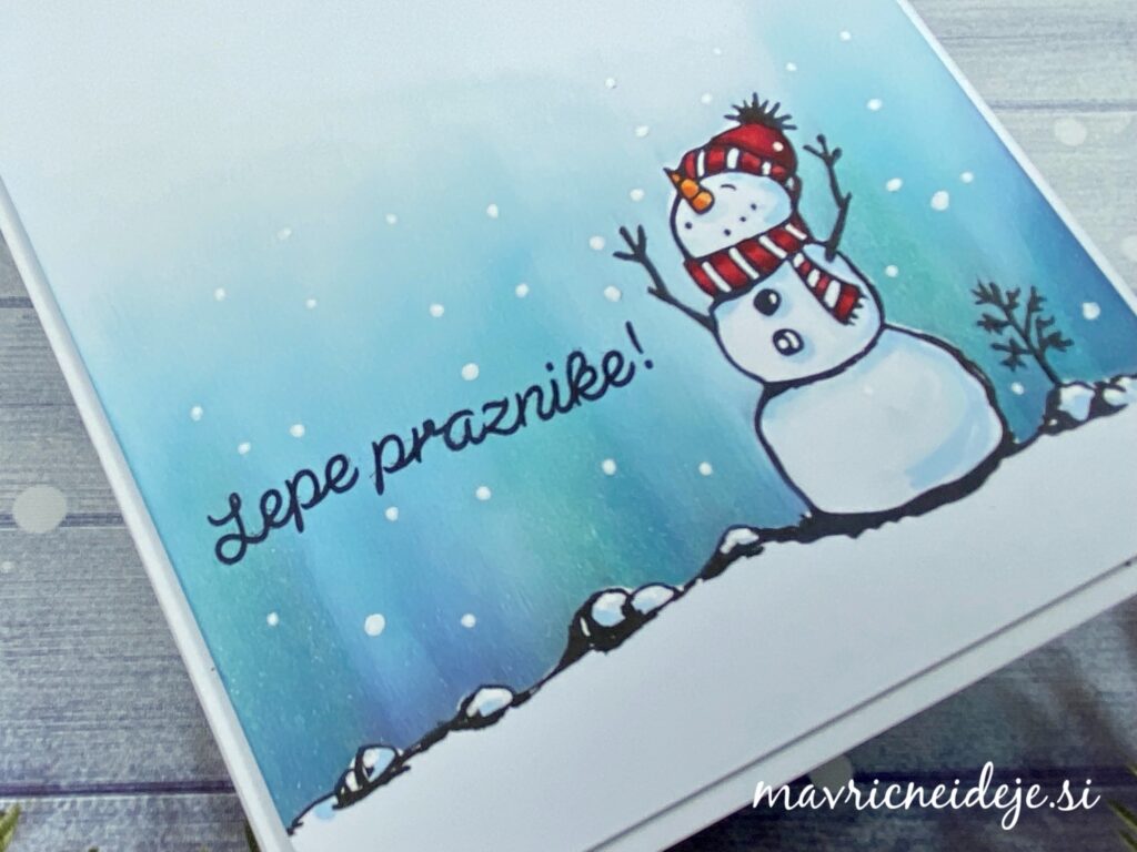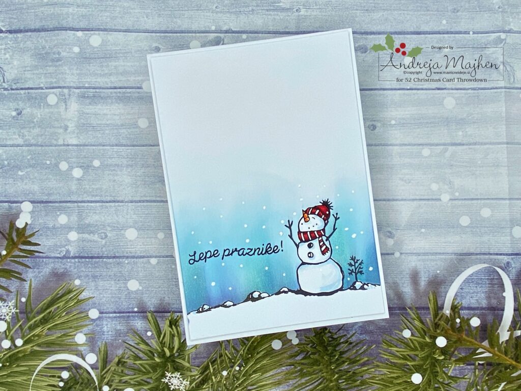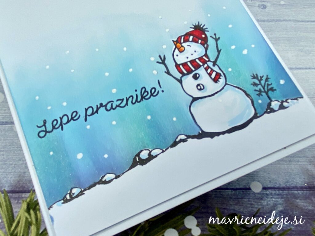 Pozdravljenjeni v sobotno jutro, kot vsak mesec je tudi tokrat prvi izziv za izdelavo novoletne voščilnice skica. Kakorkoli sem jo gledala, sem v mislih videla le sneženega moža in ker je bila to najenostavnejša izbira, sem malce zakomplicirala ipri tehniki. izbrala sem mixed media tehniko.