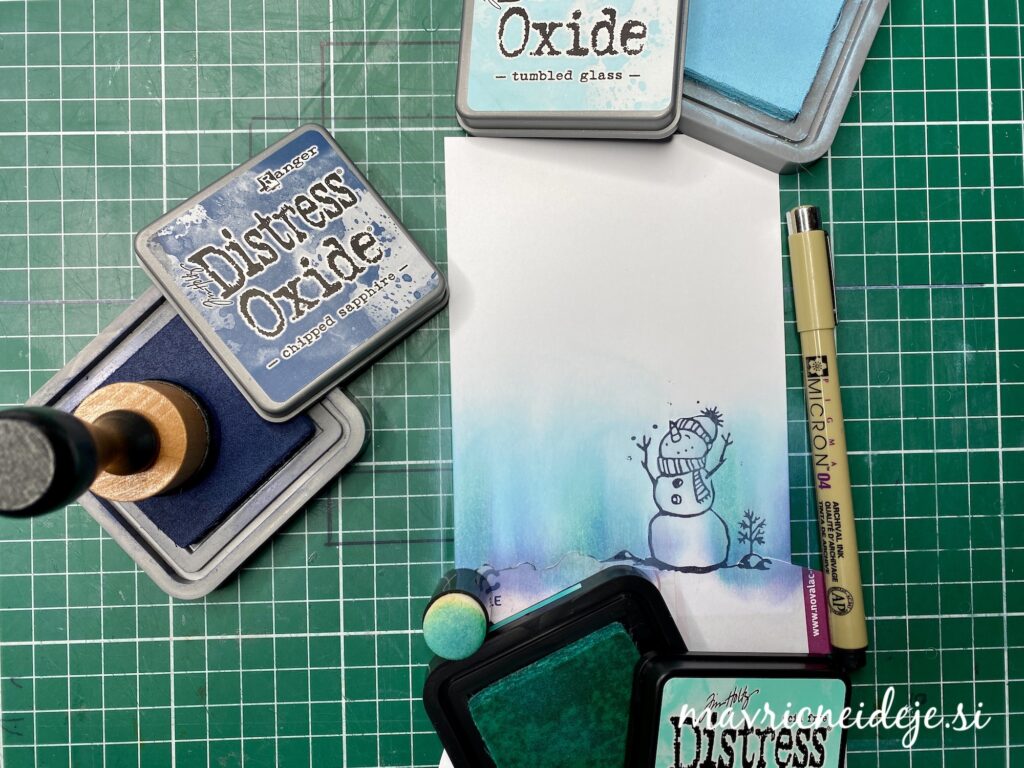 Ozadje sem izdelala z distress inki, ki sem jih nanašala v smooshing tehniki, z valjčkom in štampiljko.