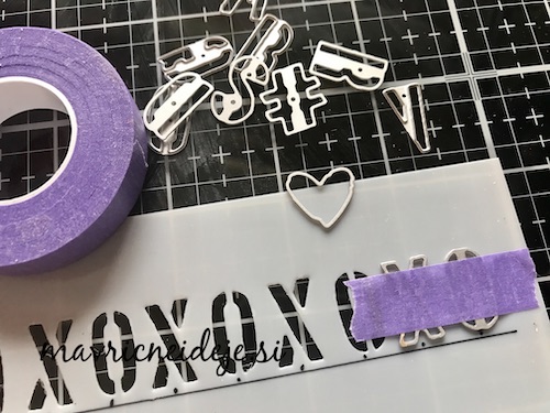 Za sestavljanje drobnih izrezov uporabljan lepljivo podlago, ki je del pripomočka za odtise Altenew Stampwheel. Drobni delci so na leplivi podlagi pri miru in se pri sestavljanju ne spodmikajo.