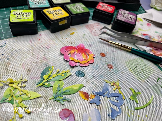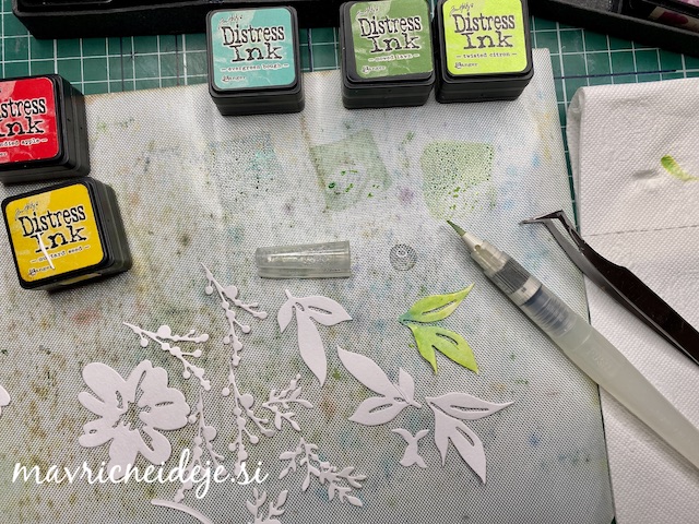 Motive sem izrezala iz Florence akvarelnega papirja in jih pobarvala z Distress Inki. delala sem na Tonic Studio Non-Stick Mat podlohi, ki je pravzaprav nadomestni del pri Veliko stekleni ustvarjalni plošči.