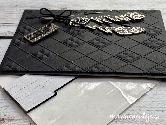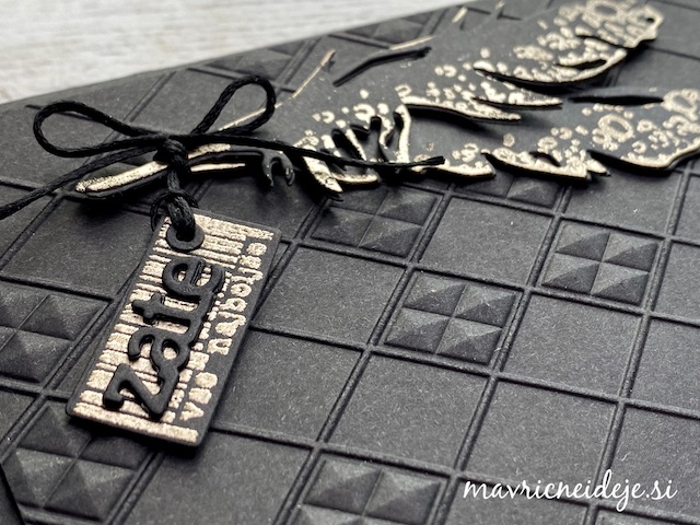 Črn papir sem embosirala v teksturni srajčki in nato preko ujemajoče plastične šablone nanesla zlato blazinico.