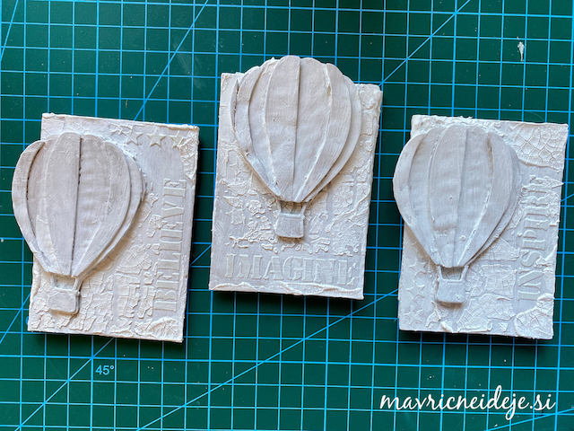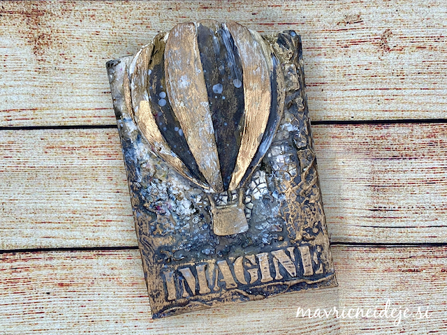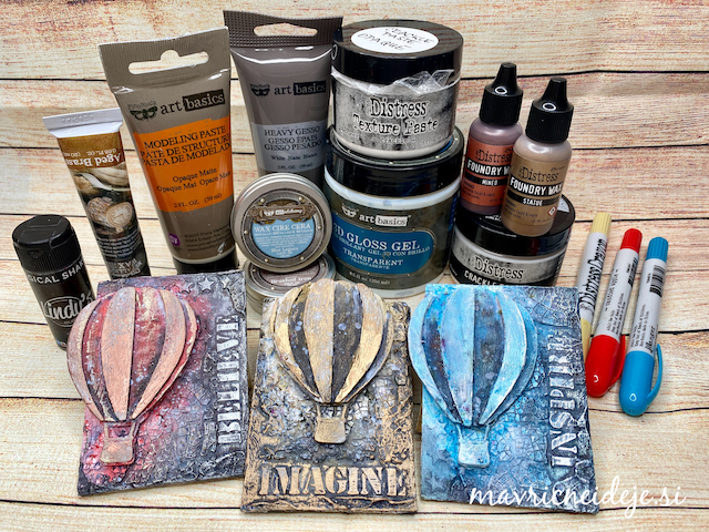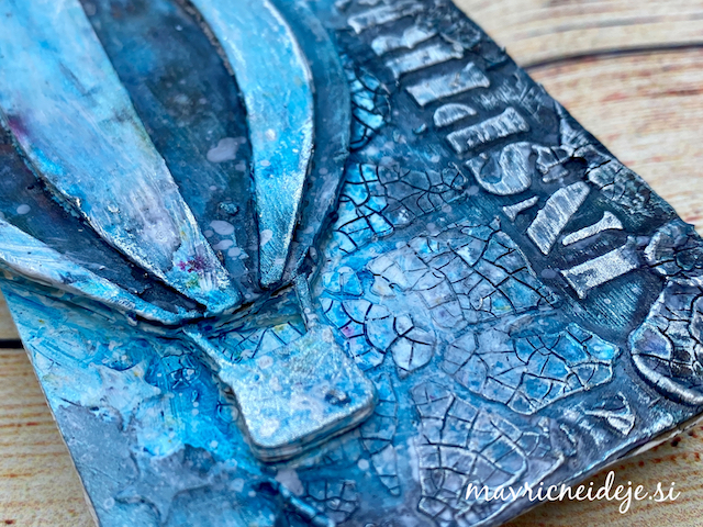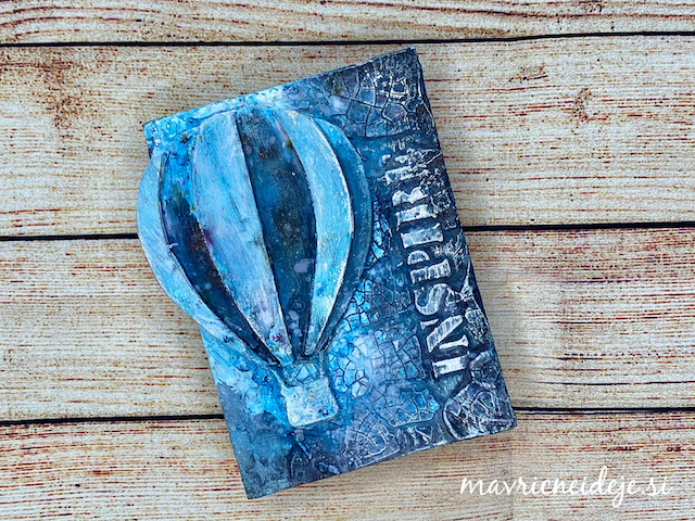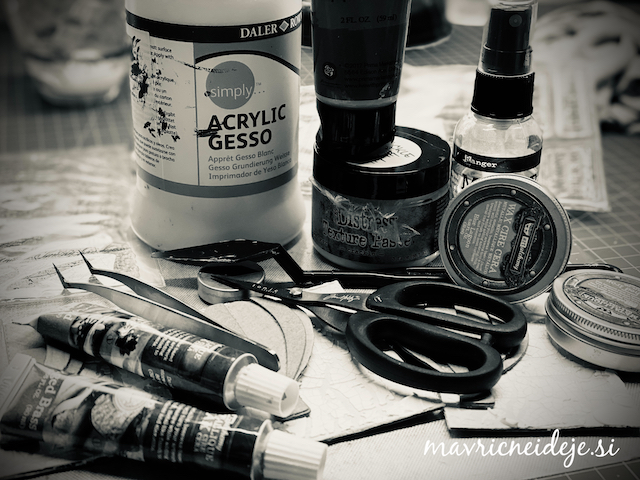 S črno archival blazinico sem odtisnila različne štampilke. Za osrednji del sem uporabila masko – izrez kroga. Nato sem papir pobarvala na rjavo.