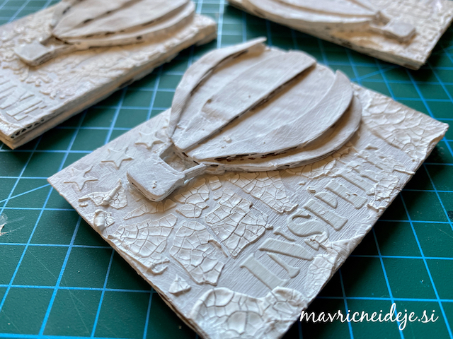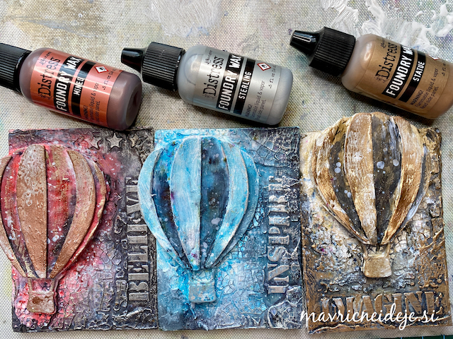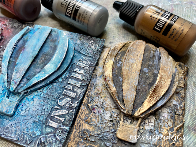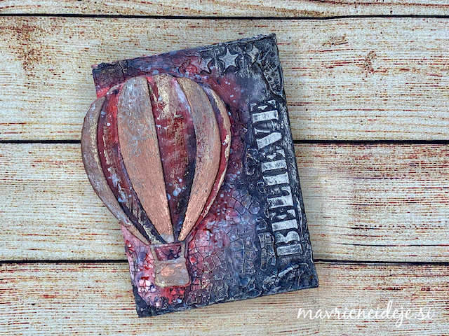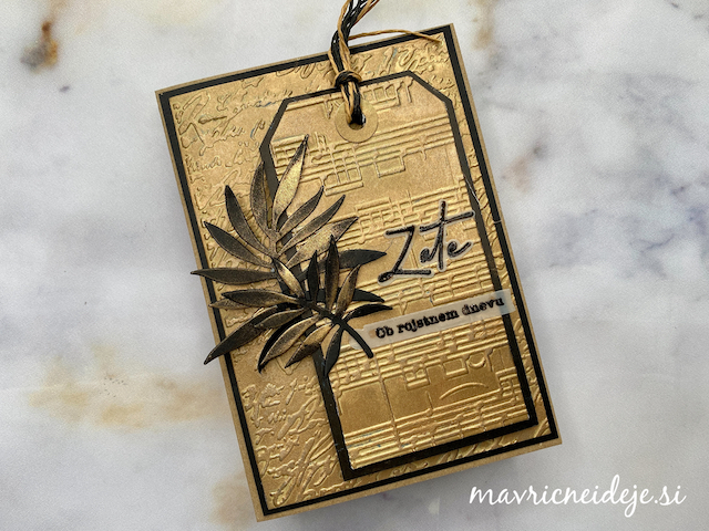 Izdelan papir sem narezala na obliko osnove za voščilnico. Robove sem osenčila s temno rjavo in dodala Distress spritz – rjave bleščice.