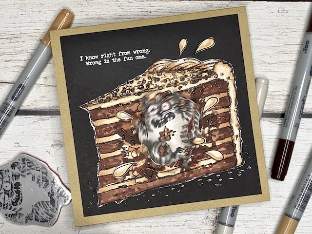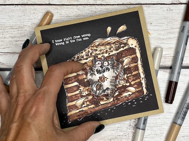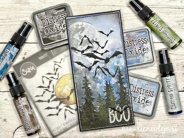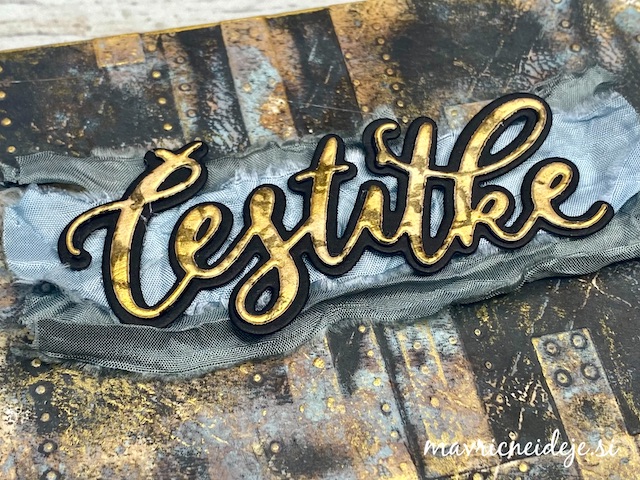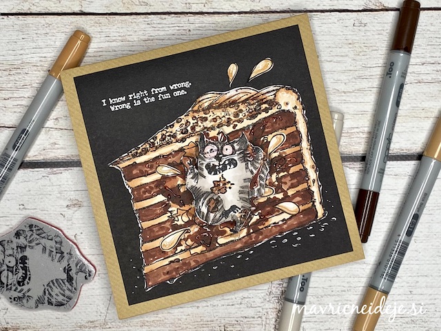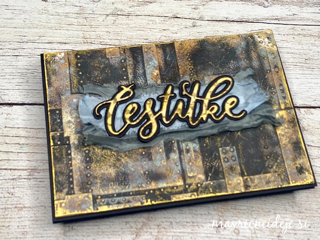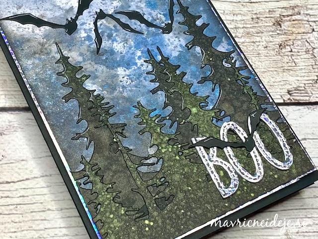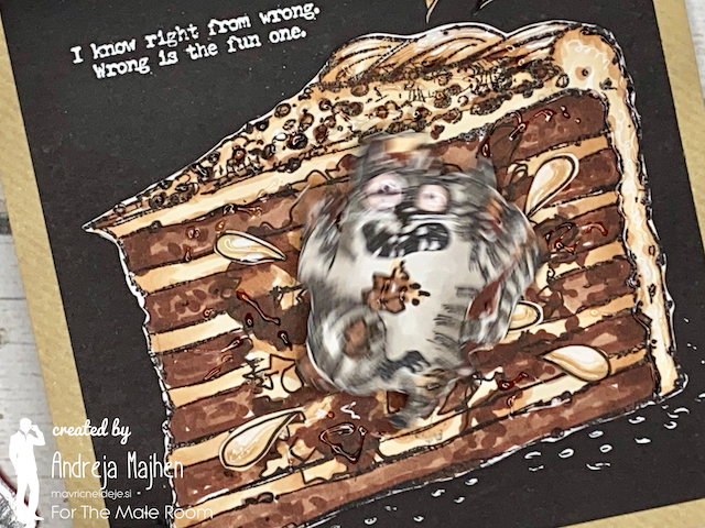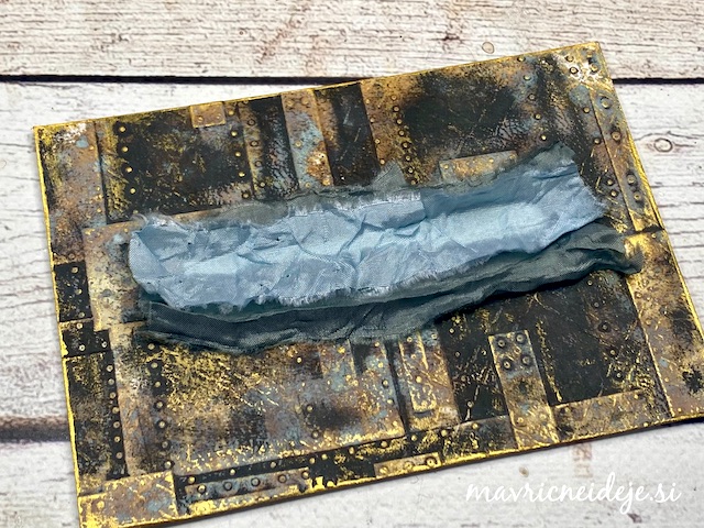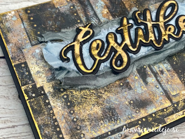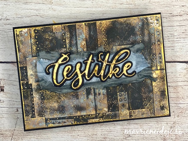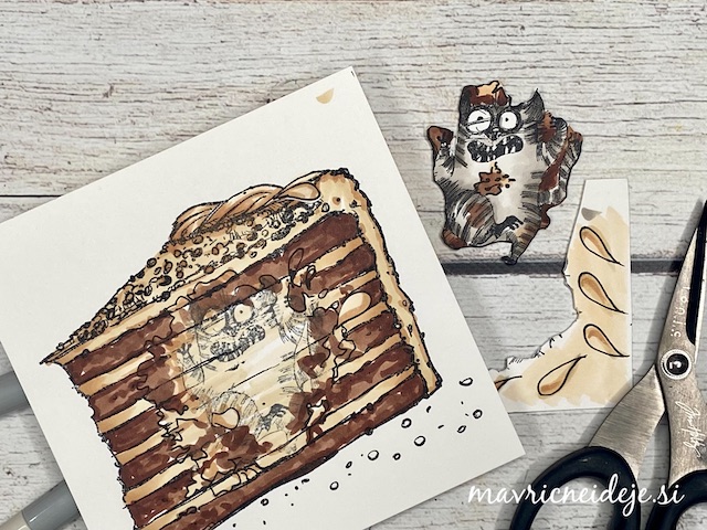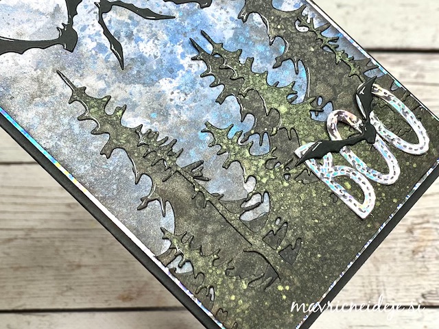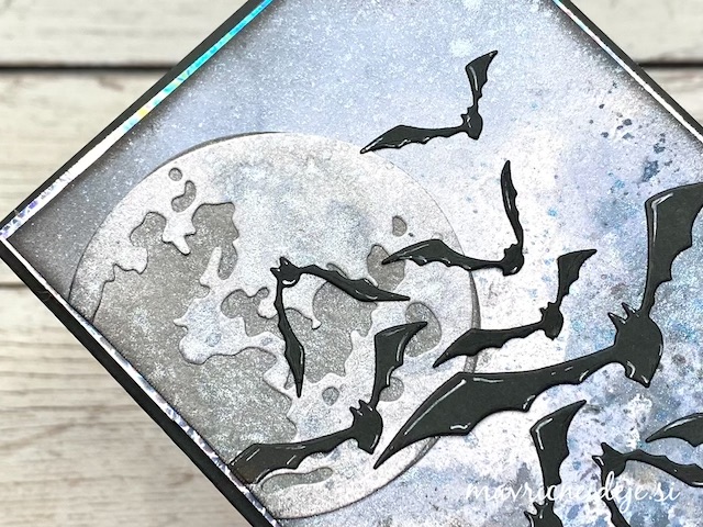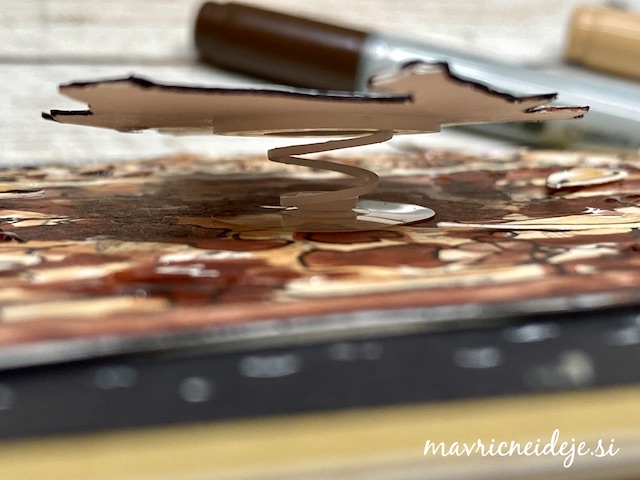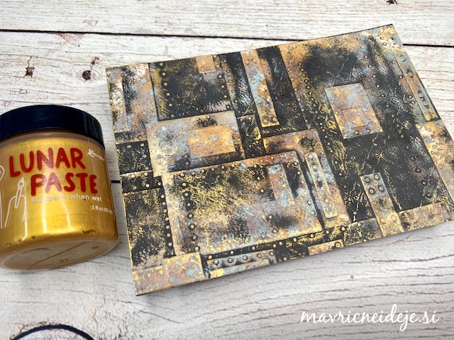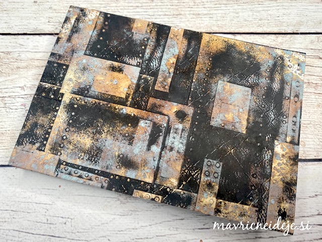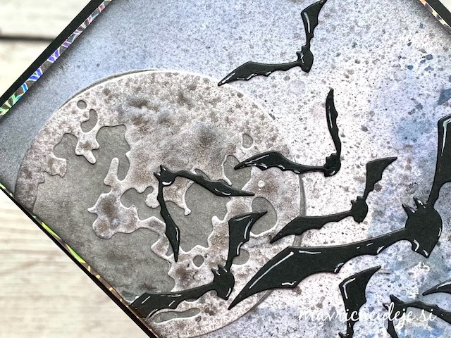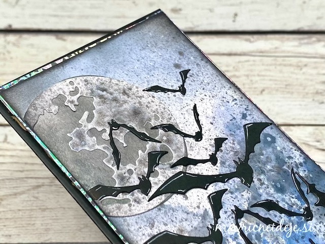 S tehniko ink smooshing sem izdelala ozadje na katerega sem s pahljačastim čopičem nanesla drobne kapljice. Nekaj plasti sem nanašala mokro na mokro, nekaj pa mokro na suho. Tako nastanejo zanimivi vzorci, kjer se nekatere plasti prelijejo, druge pa imajo ostre robove.