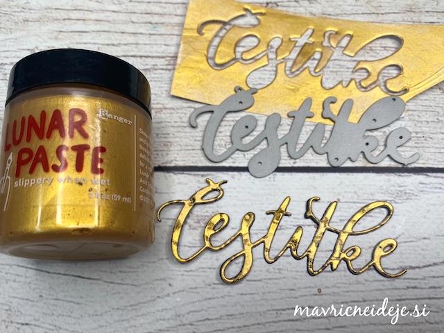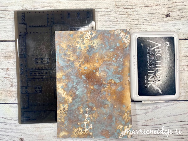 Z vodoodporno blazinico sem na suho ozadje odtisnila motiv in ga med barvanjem pustila kar v pripomočku za odtise. Motiv sem ponovno odtisnila, ko so bile barve čisto suhe.