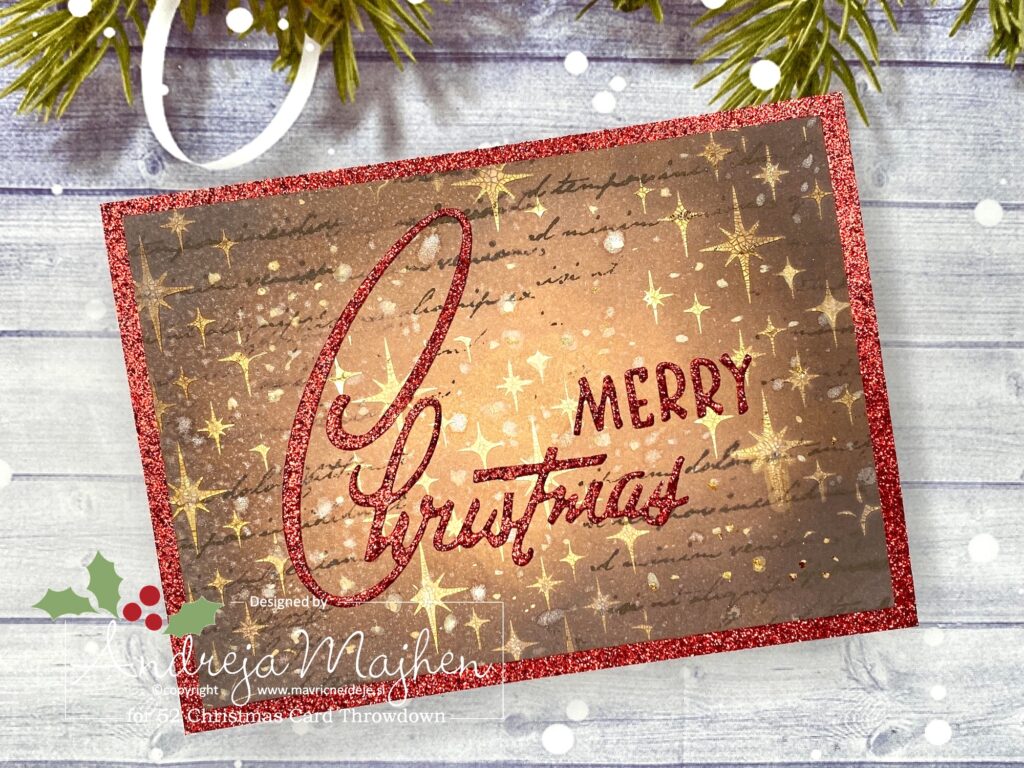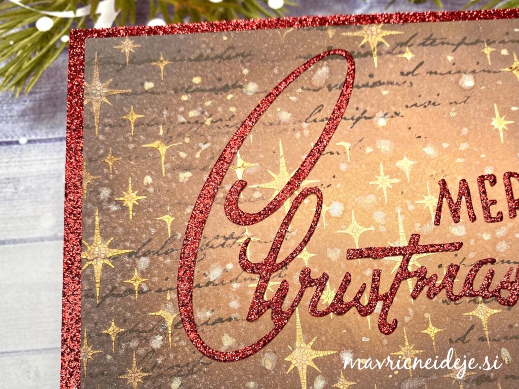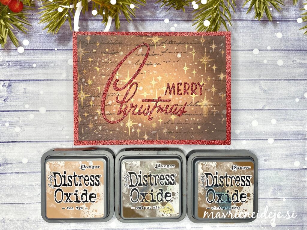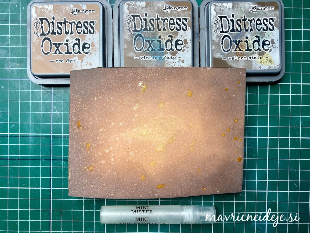 Na Florence akvarelni papir sem z aplikatorji nanesla tri rjave odtenke Distress Oxide in dodala Perfect Pearls v pršilki, da so nastale neenakomerne pearl kapljice.